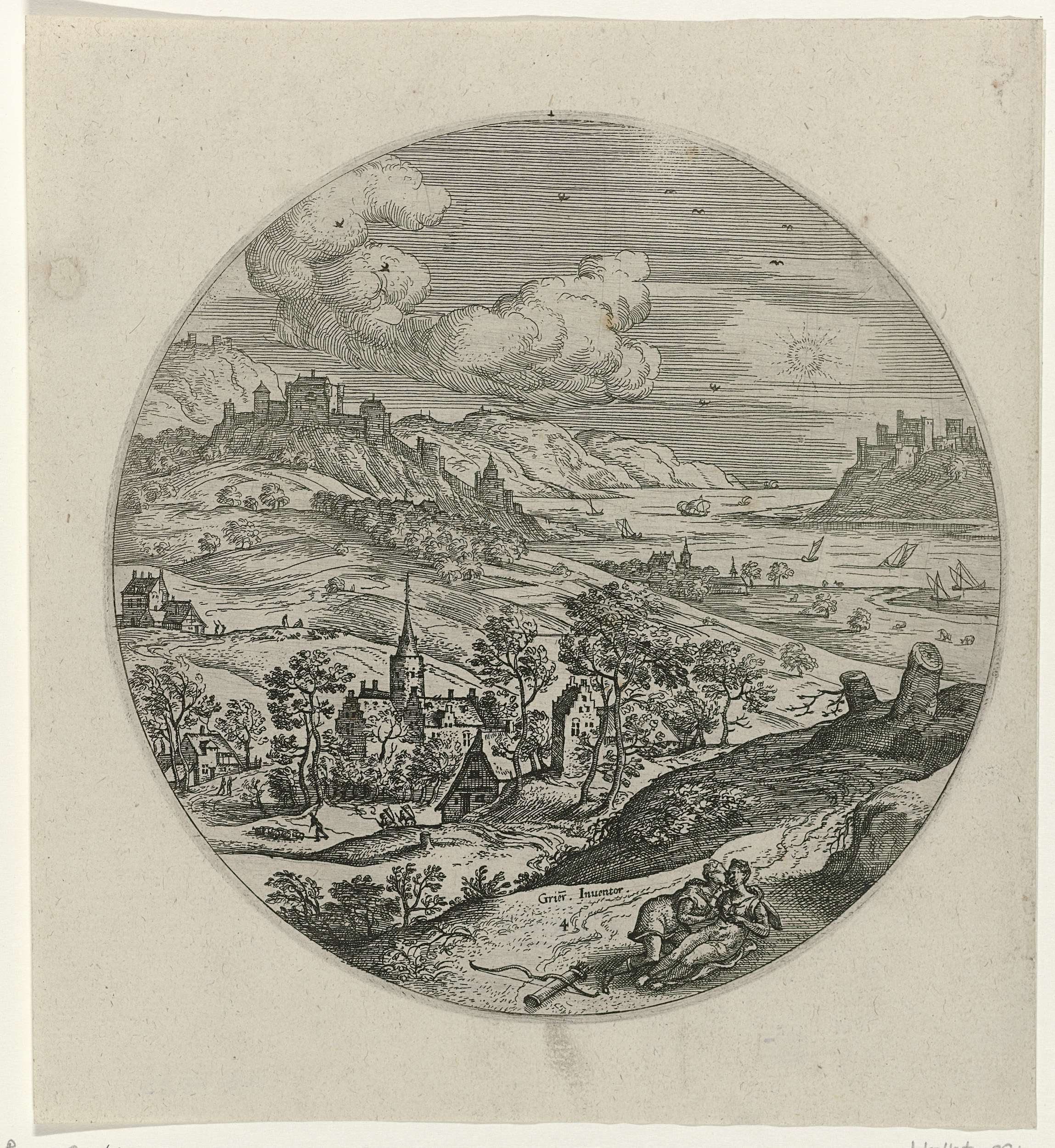 Procris, getroffen door haar eigen magische pijl, sterft in de armen van haar geliefde Cephalus, die verantwoordelijk is voor haar dood. In de achtergrond een landschap. De prent is deel van een serie over het mythologische verhaal van Procris en Cephalus.