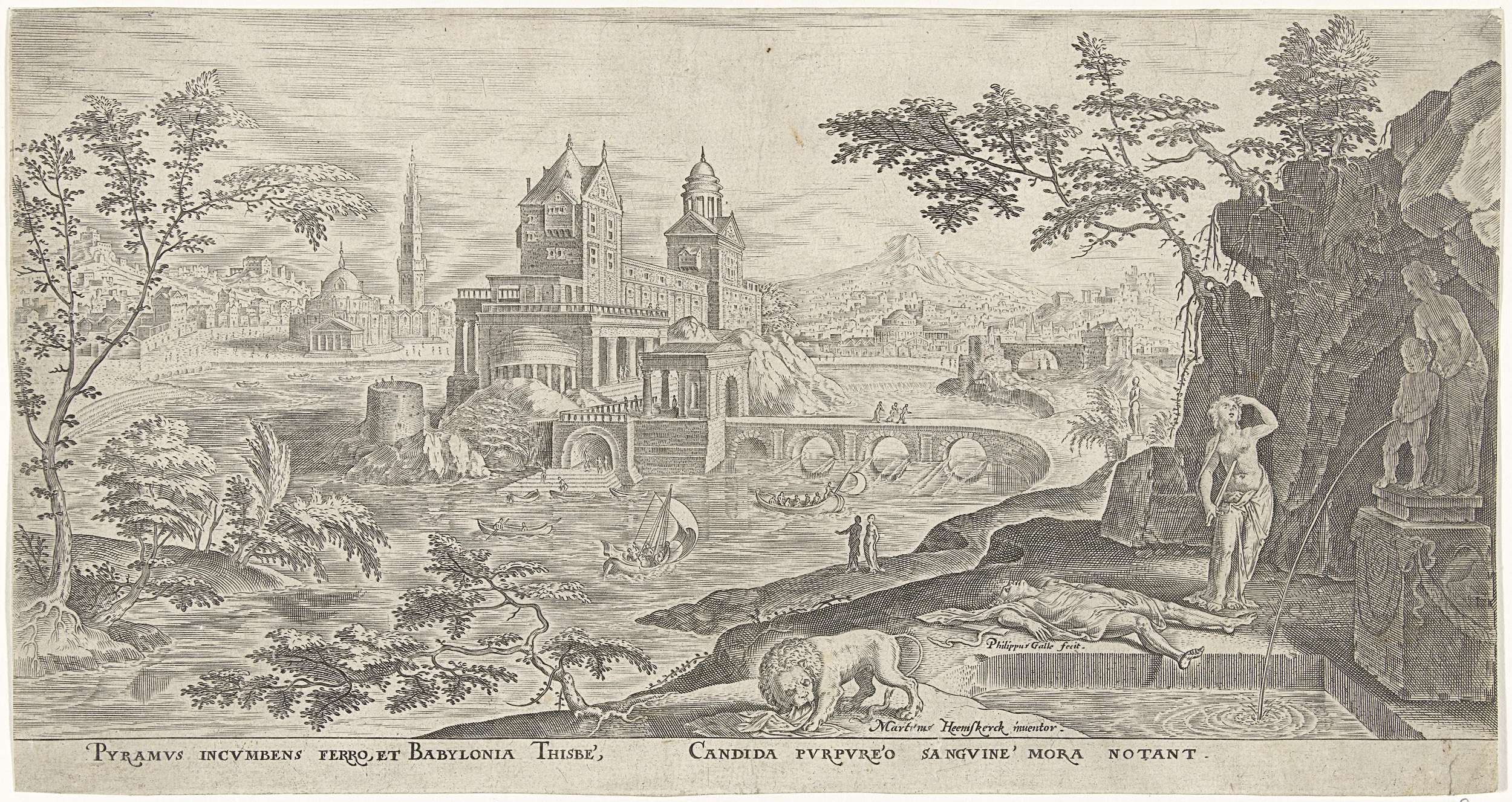In de achtergrond een fantasielandschap met een kasteel. In de voorgrond Thisbe, die bij het zien van Piramus' lijk zichzelf met een zwaard doorboort. Naast het lijk van Piramus de leeuw die de mantel van Thisbe verscheurd. De prent heeft een Latijns onderschrift.