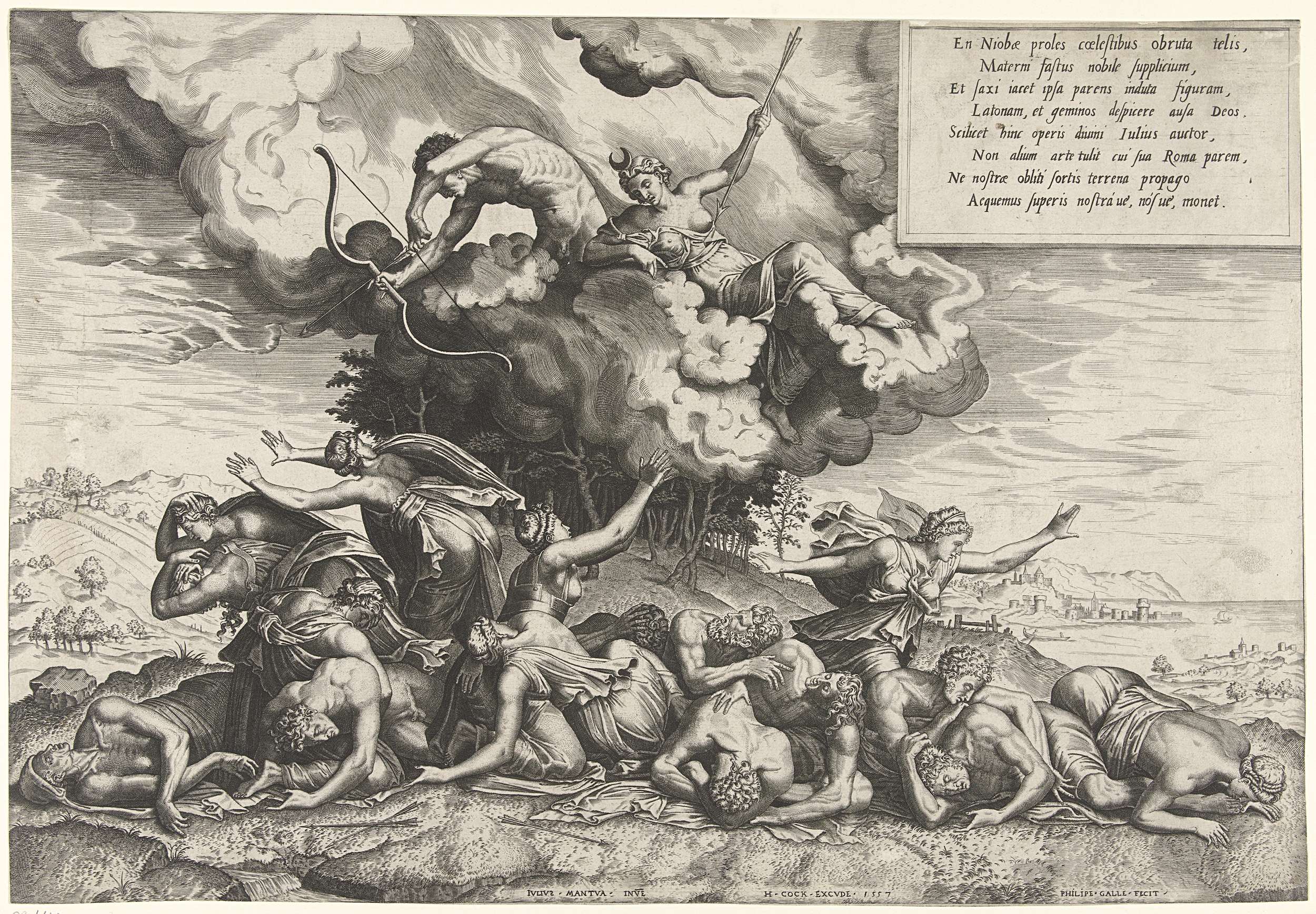 In de wolken Apollo en Diana. Met pijlen beschieten zij de kinderen van Niobe, die in haar hoogmoed zichzelf beter vond dan de goddelijke tweeling. De grond ligt bezaaid met doden en stervende kinderen. Sommigen proberen tevergeefs te vluchten. De prent heeft een Latijns bovenschrift in een kader.