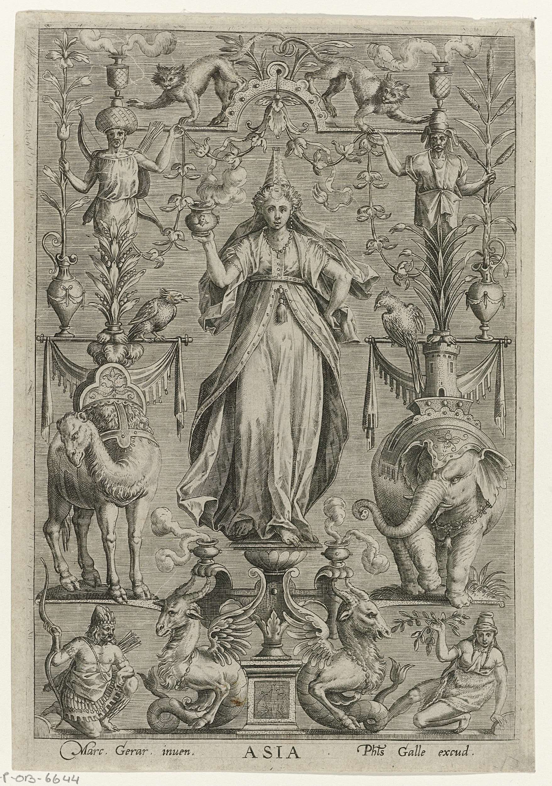 De personificatie van Azië, staande op een sokkel omringd door ornamentele versieringen. Ze heeft een wierrookpot in haar handen en wordt geflankeerd door een dromedaris en een olifant. Boven haar twee aapjes en twee Ottomanen. Onderaan de prent twee hermen. De prent is deel van een reeks over de vier werelddelen.