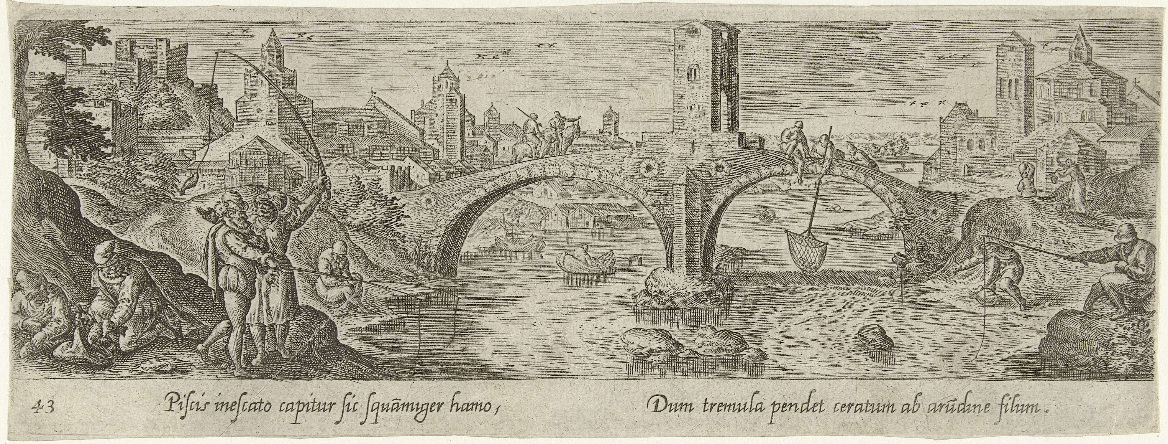 Aan de oever van een rivier vangen enkele mannen vissen met behulp van een hengel. In de achtergrond een brug over de rivier. Daar trachten mannen vis te vangen met een schepnet. De prent heeft een Latijns onderschrift en maakt deel uit van een serie van 54 prenten.