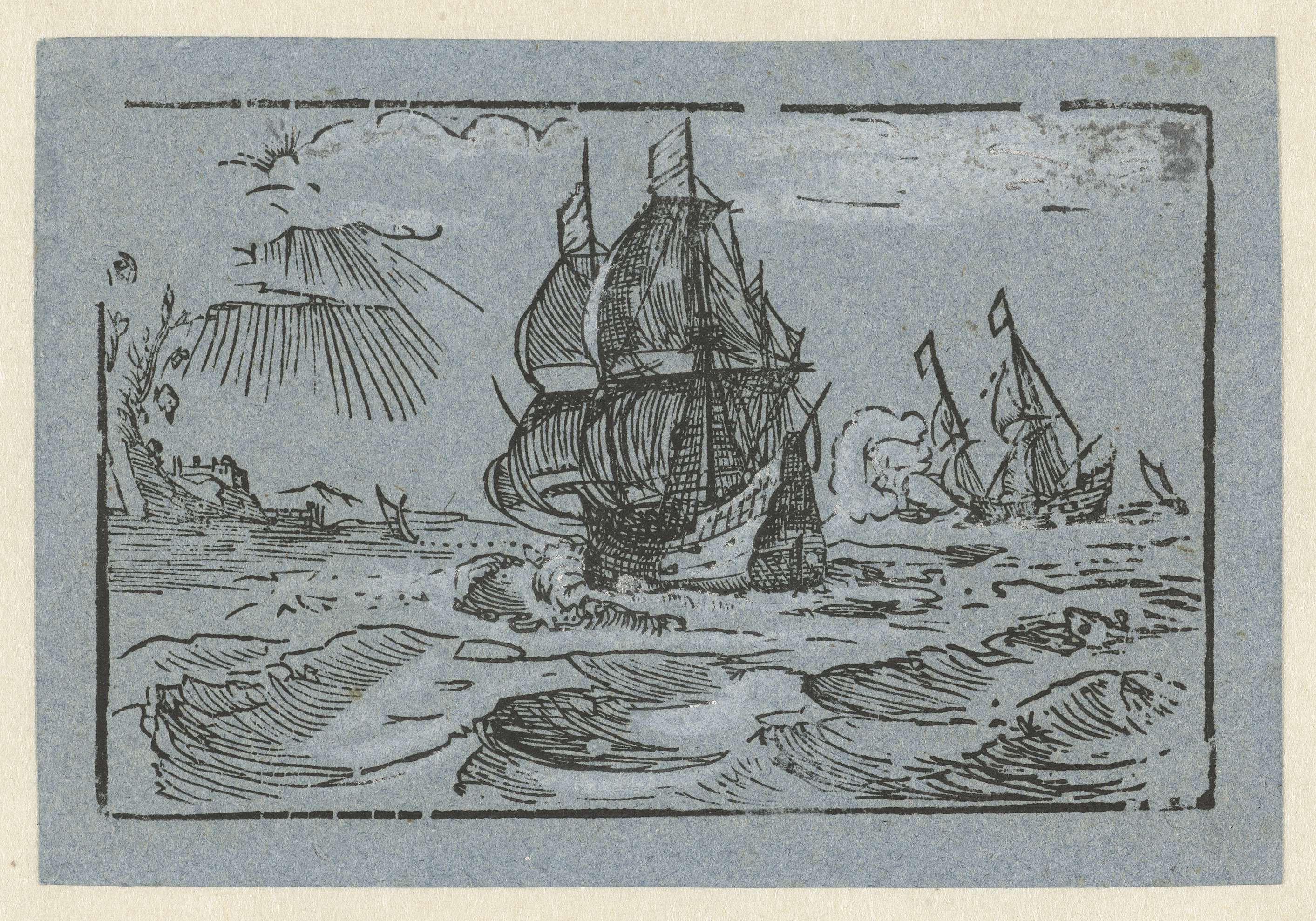 Een groot schip voor een kust. Op de achtergrond nog een zeilschip, met rookwolken (of een golf) bij de achtersteven. De zon breekt linksboven door de wolken.