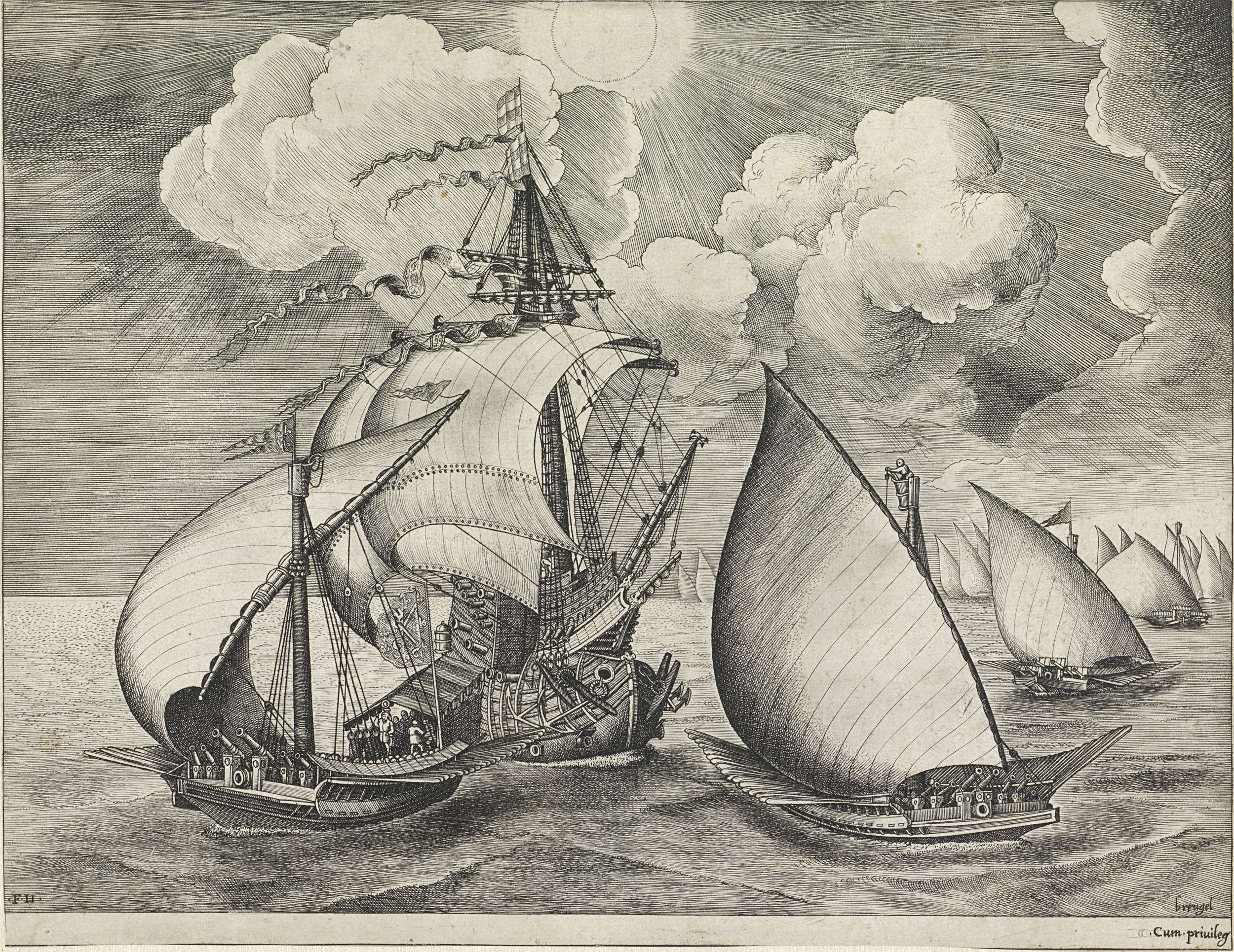 Een vloot bewapende galeien door een oorlogsschip vergezeld.