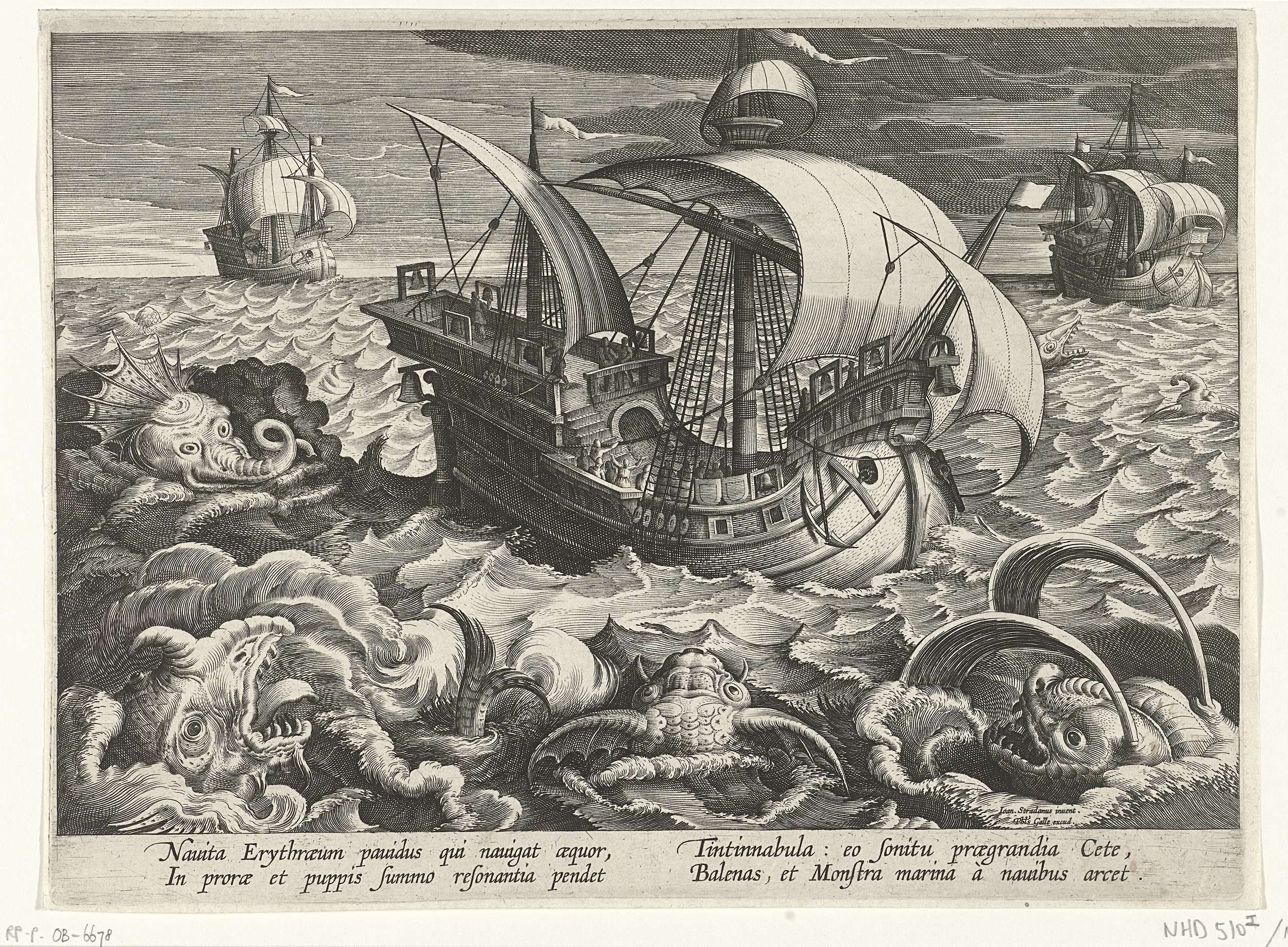 Vier zeemonsters vallen een galjoen aan in open zee. Door het luiden van de scheeps klokken worden de monsters op afstand gehouden. De prent heeft een Latijns onderschrift en is deel van een serie over jachttaferelen.