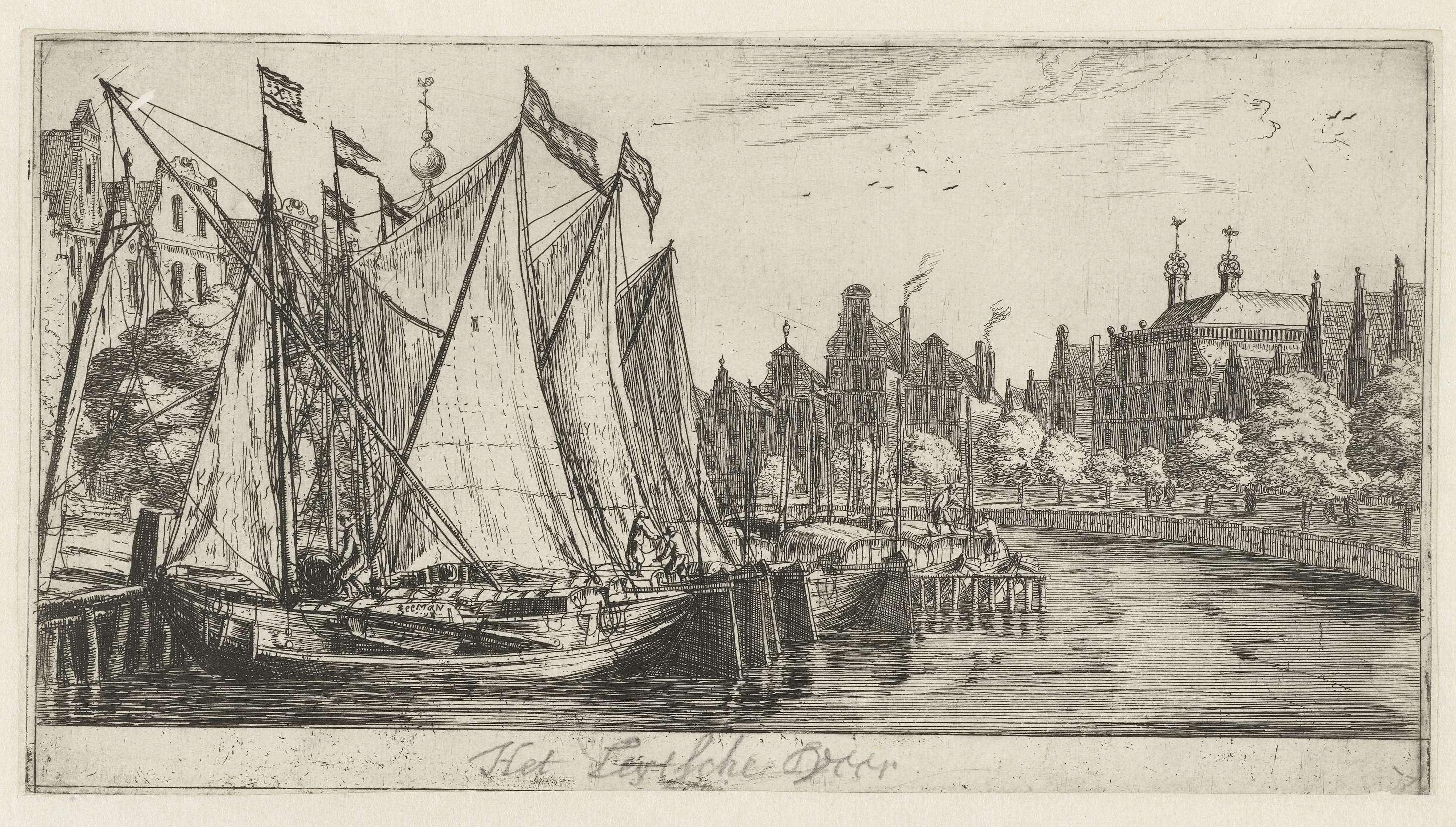 Het Singel met op de achtergrond de top van de Munttoren zichtbaar. Rechts het huis van burgemeester Huydecoper, Singel 548. Op de voorgrond zeilschepen en daar achter het veer naar Leiden.