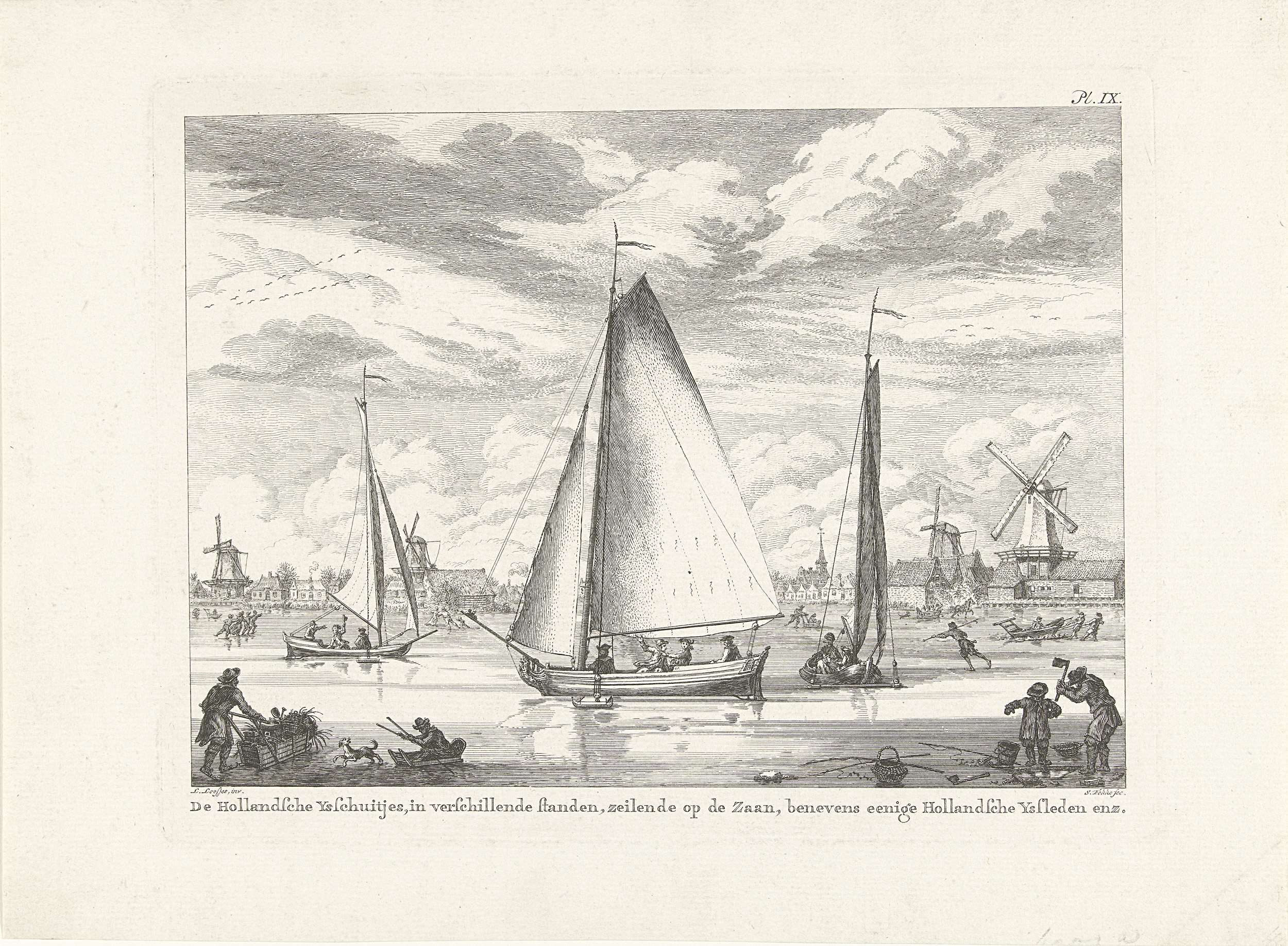 IJsgezicht op de Zaan met ijsschuiten en schaatsers. Op de voorgrond staan rechts vissers bij een wak en links figuren met ijssleden. In de verte de contouren van de Zaanse Schans, ca. 1775. Onder de afbeelding een regel tekst in het Nederlands. Gemerkt rechtsboven: Pl. IX.