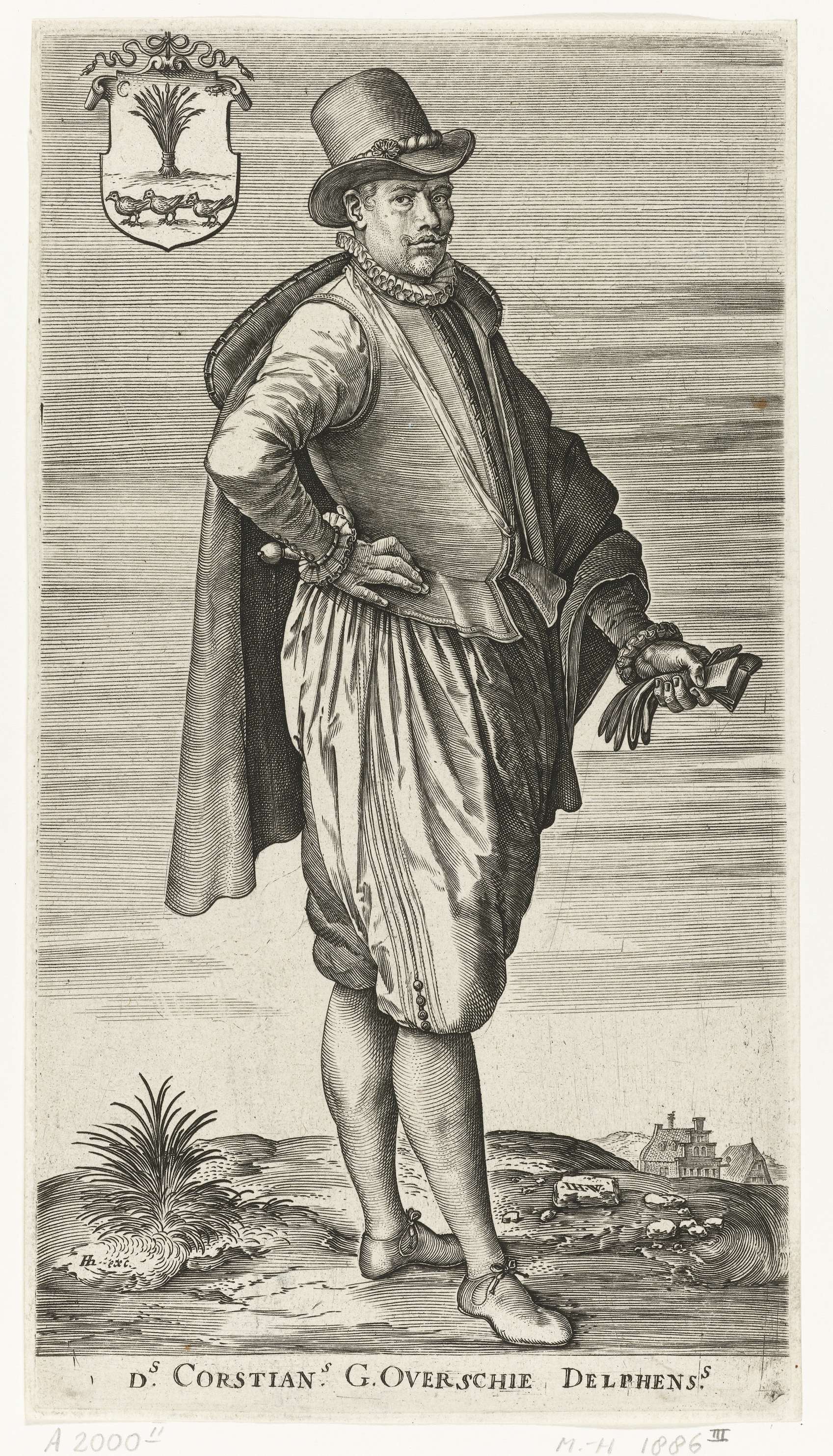 Portret van Corstianus G. Overschie, ten voeten uit, in de buitenlucht, een paar handschoenen in de hand. Linksboven zijn wapenschild.
