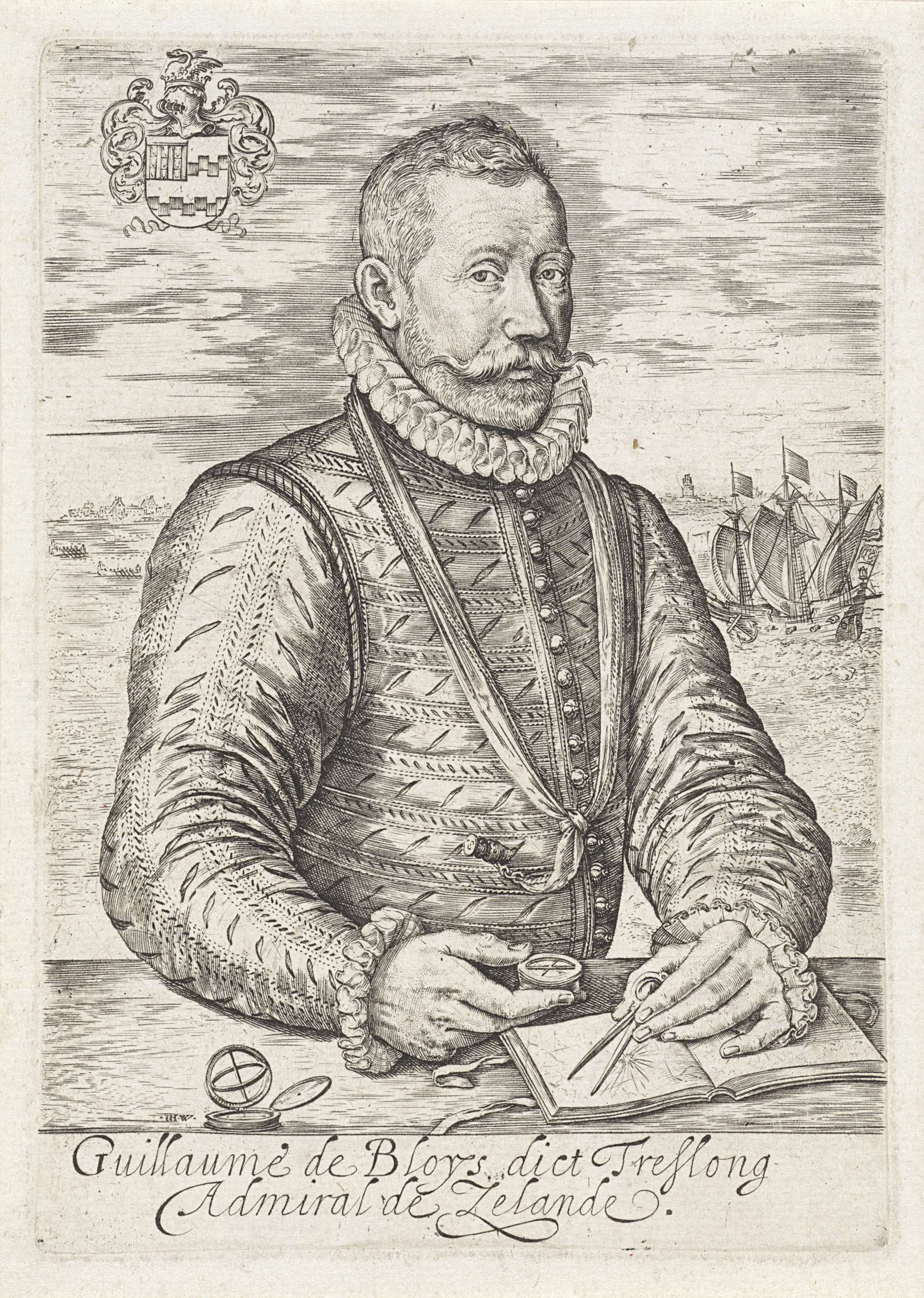 Hij houdt een kompas in de hand en tekent met een passer op een kaart. Op de achtergrond schepen op zee. Linksboven zijn wapenschild. In de marge een tweeregelig onderschrift in het Frans.