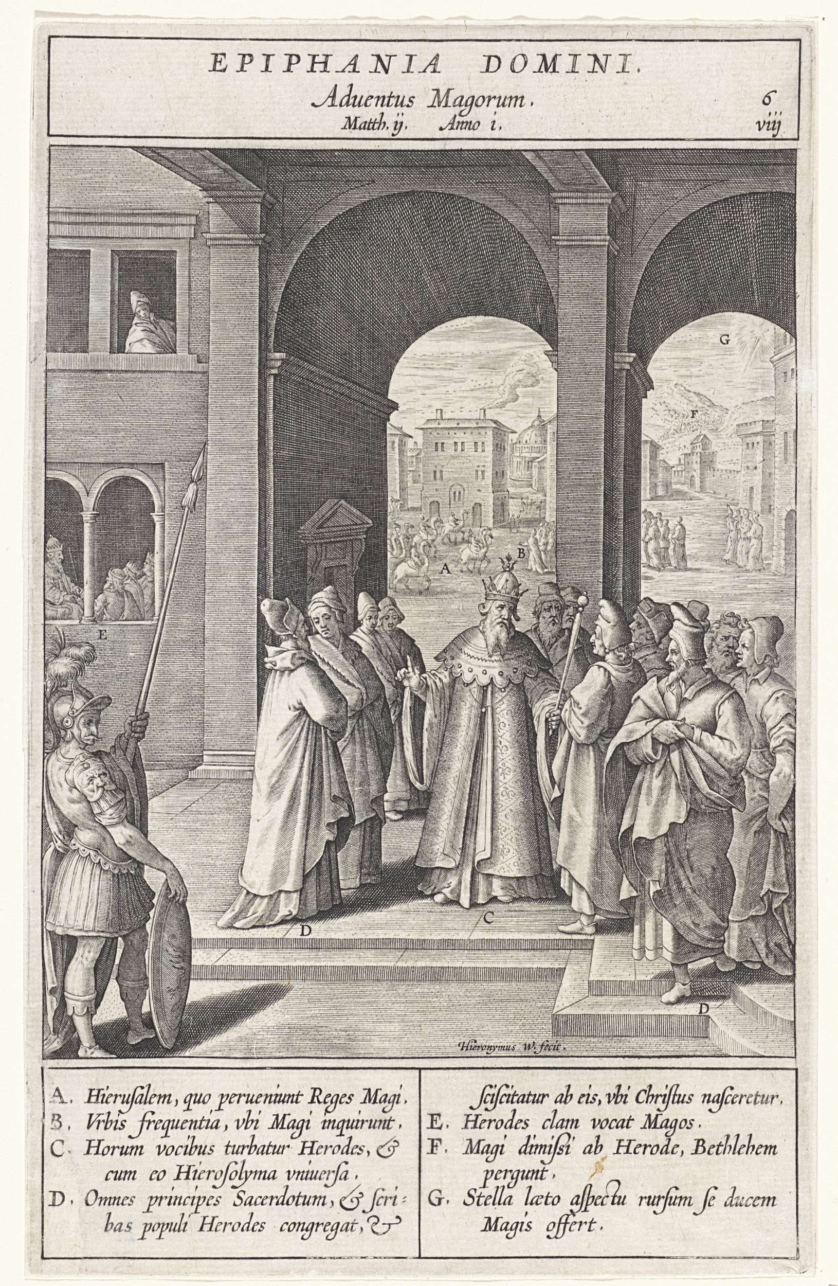 De koningen arriveren in Bethlehem. Ze hebben zich verzameld rond koning Herodes op de trappen bij de stadspoort. Bij verschillende elementen uit de voorstelling staan letters die corresponderen met de legenda in de marge.