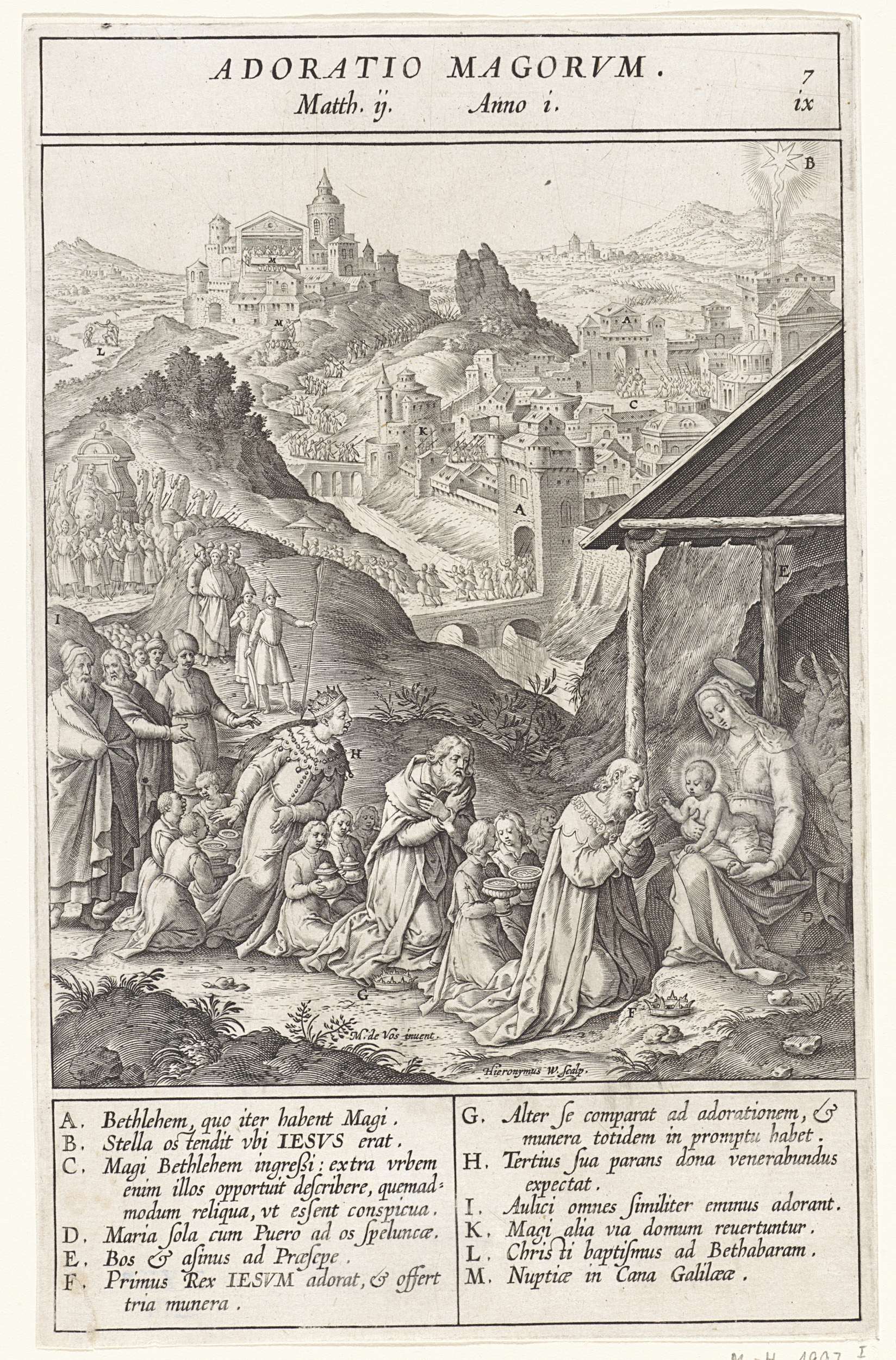 Het Christuskind, bij Maria op schoot, wordt aanbeden door de drie Wijzen uit het Oosten die zich met hun geschenken voor het Kind hebben opgesteld. Op de achtergrond leden van hun gevolg. Bij verschillende elementen uit de voorstelling staan letters die corresponderen met de legenda in de marge.