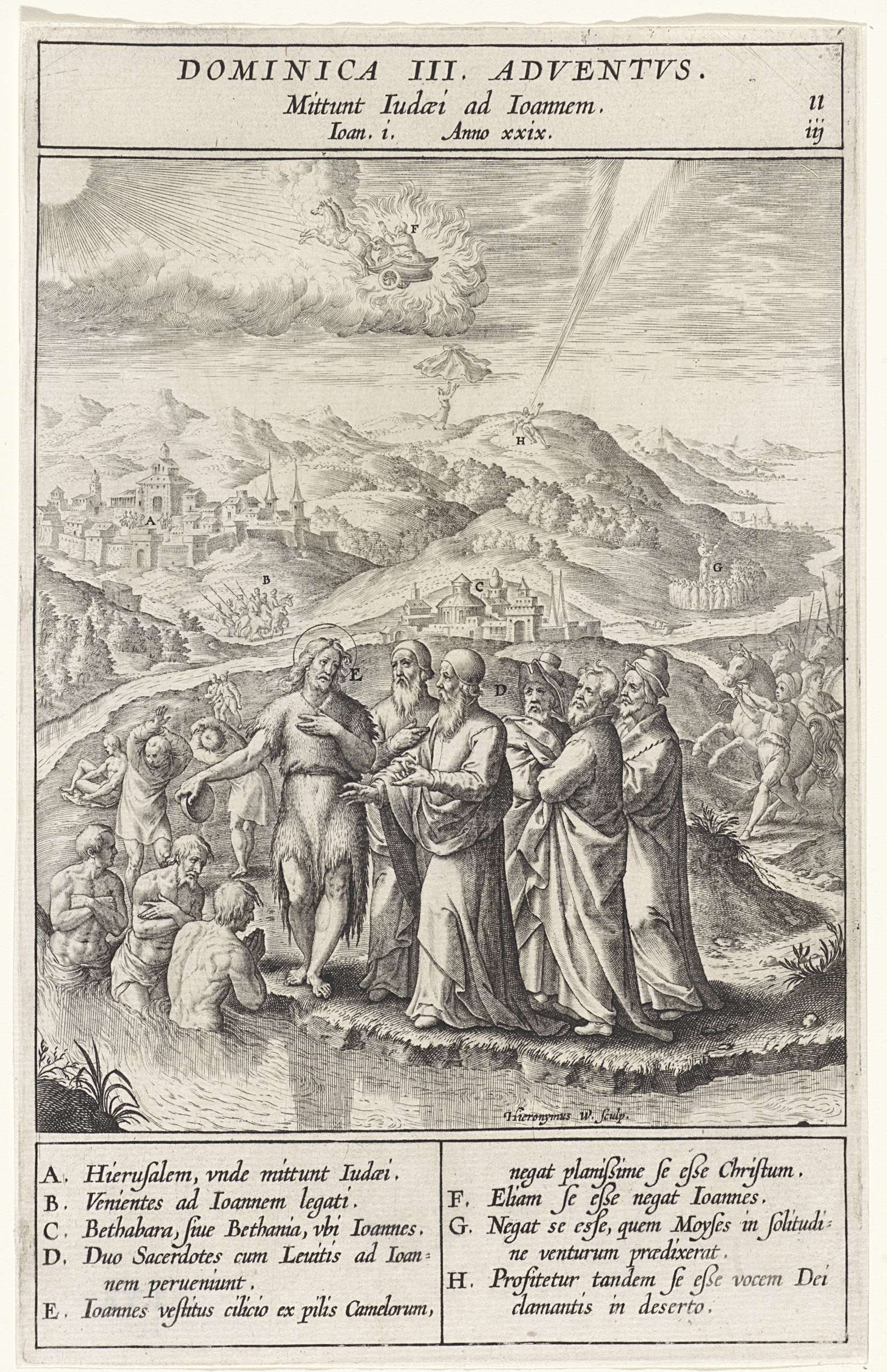 Johannes de Doper doopt gelovigen in de Jordaan. Verschillende mannen kijken toe. Bovenaan de hemelvaart van Elia. Hij wordt door paarden in een wagen van vuur naar de hemel gevoerd. Bij verschillende elementen uit de voorstelling staan letters die corresponderen met de legenda in de marge.