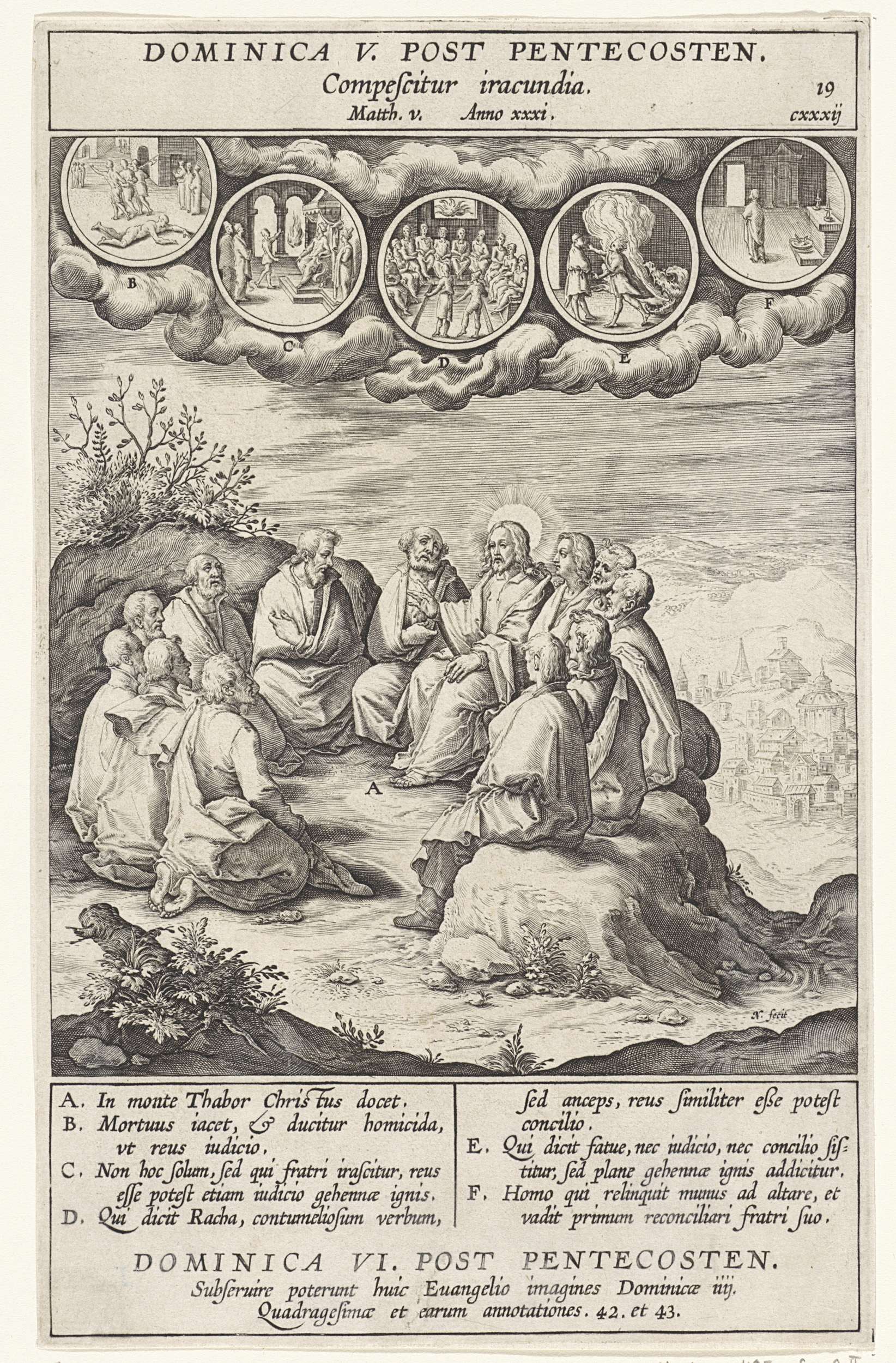 Christus zit op de top van een berg en zet zijn leer uiteen. Hij is omringd door mannen die naar hem luisteren. Bovenaan in medaillons diverse scènes. Bij verschillende elementen uit de voorstelling staan letters die corresponderen met de legenda in de marge.