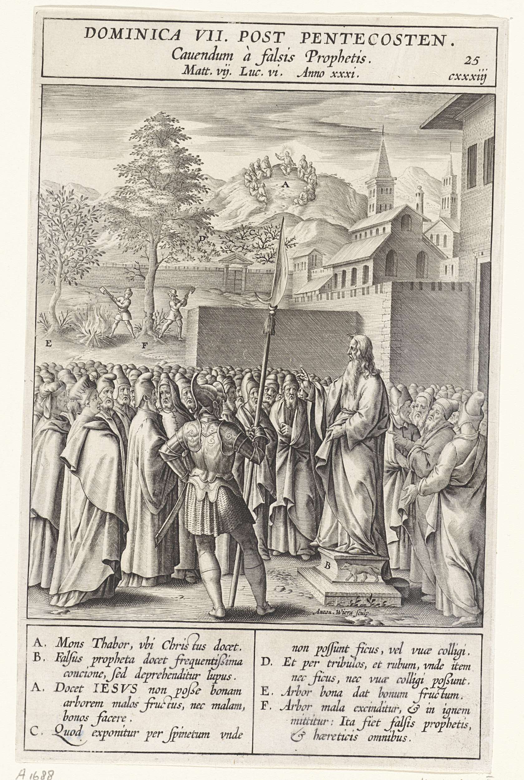 De valse profeet [een roofzuchtige wolf in schaapskleren], die op een sokkel met een wolf staat, predikt te midden van het volk. Bij verschillende elementen uit de voorstelling staan letters die corresponderen met de legenda in de marge.