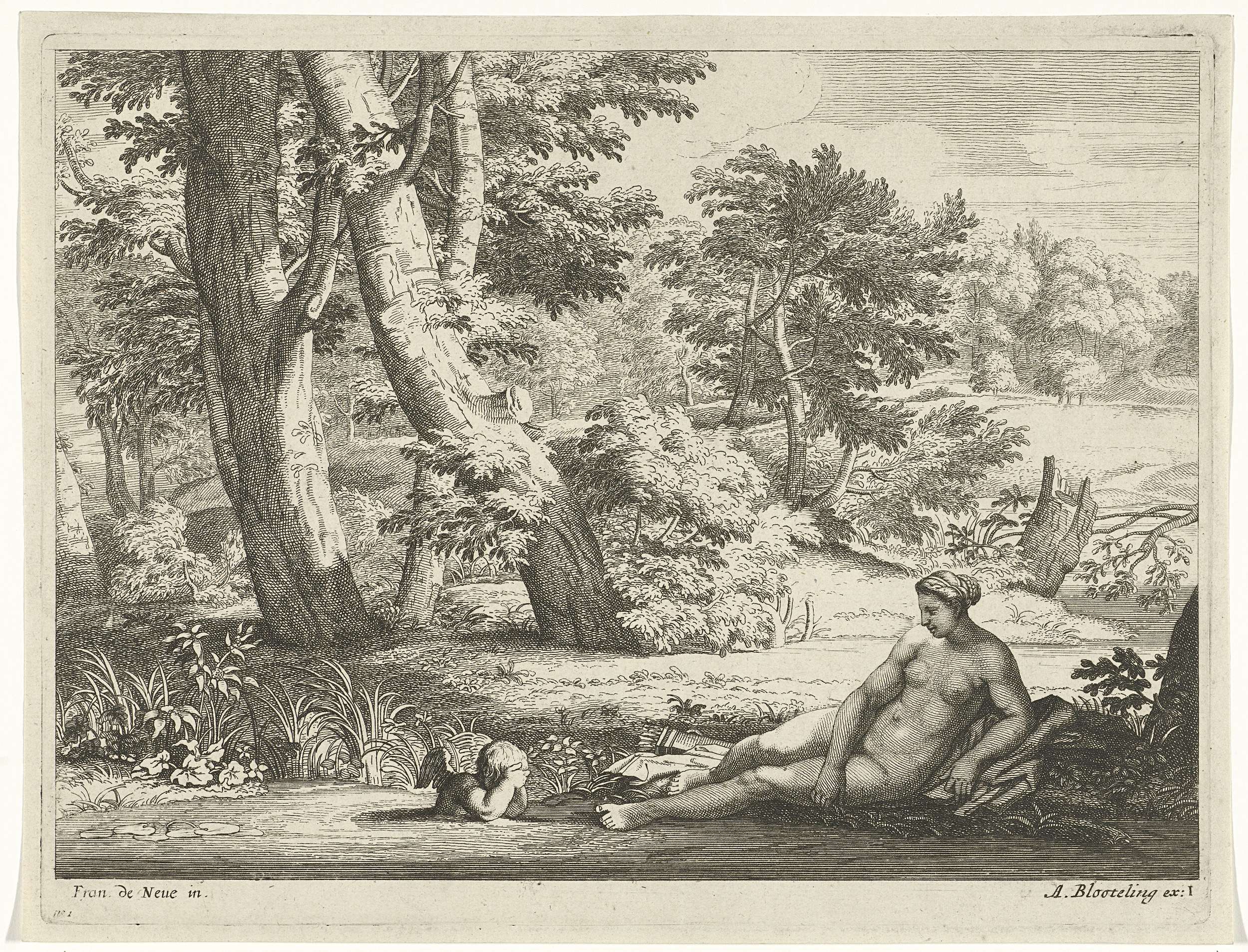 Venus ligt naast het water, terwijl zij kijkt naar Amor, die zich baadt. Op de achtergrond een heuvelachtig landschap met bomen.