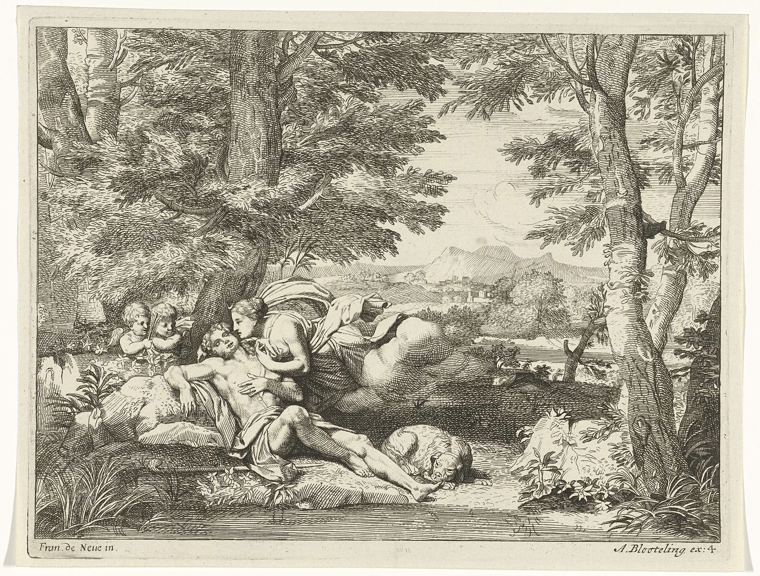 Diana bezoekt de eeuwig slapende schone jongeling Endymion. Het tafereel wordt gadegeslagen door twee putti. Aan de voeten van Endymion waakt een hond.