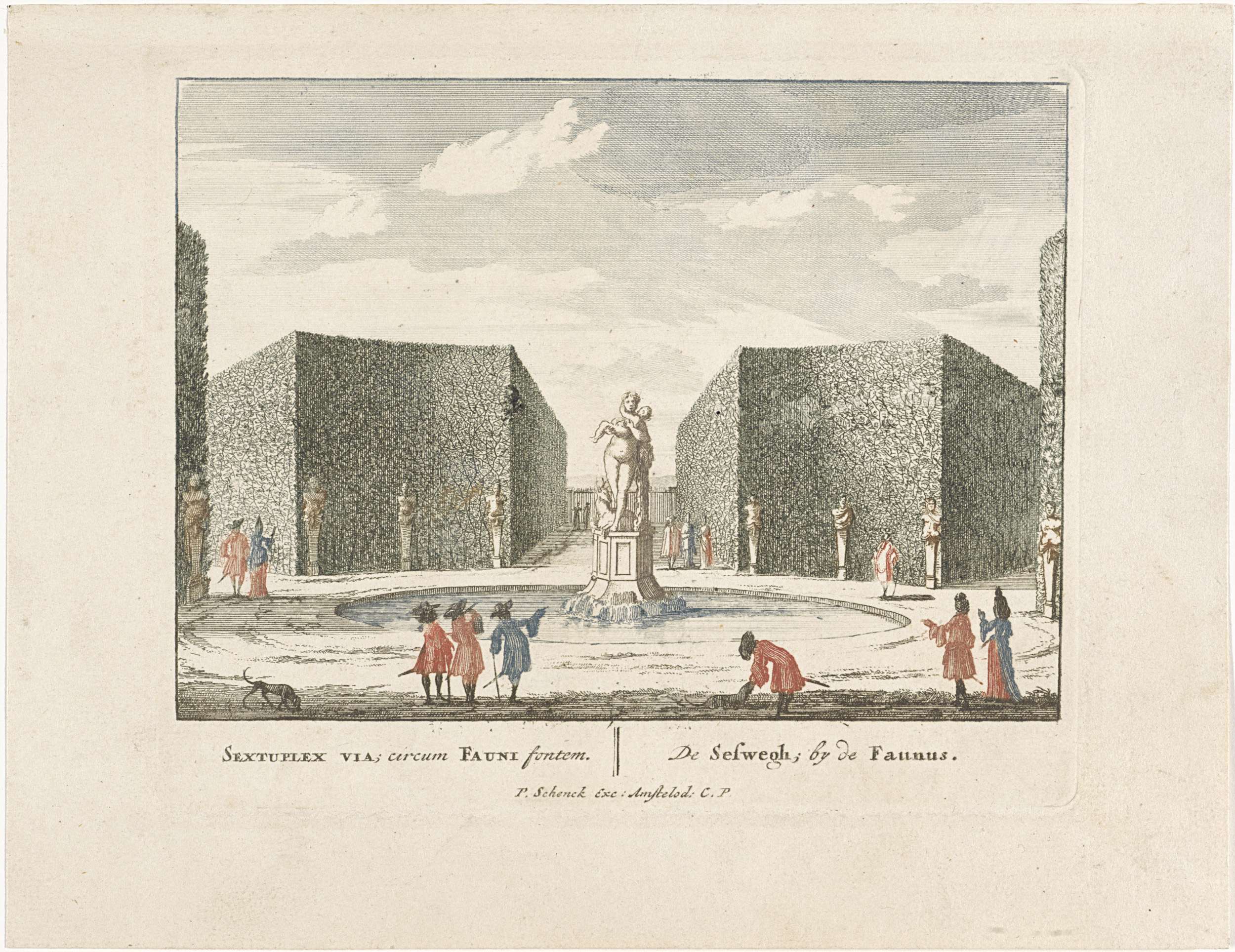 Elegant geklede dames en heren wandelen rondom een vijver met een beeld van een faun in de tuinen van Het Loo. De vijver bevindt zich op de zogenoemde 'zesweg' in het midden van het doofhof. Prent uit een serie van 71 prenten met Rijnlandschappen, gezichten op vorstelijke paleizen en stadsgezichten uit Den Haag en Amsterdam.