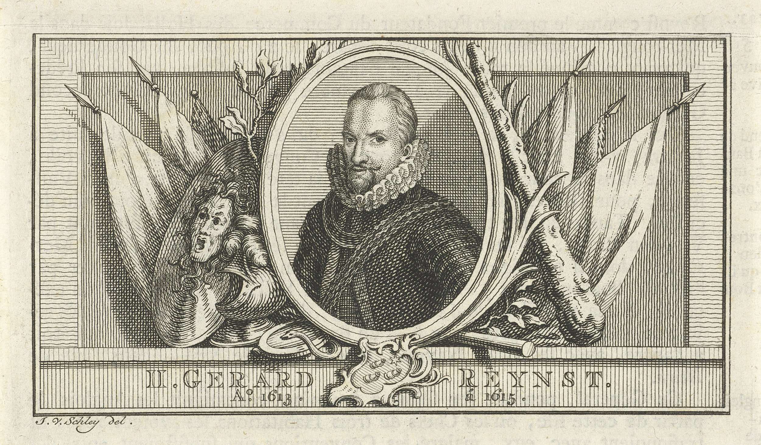 Portret van Gerard Reynst, gouverneur-generaal van het voormalige Nederlands Oost-Indië van 1613 tot 1615. Naast de omlijsting een knuppel, slang, de personificatie van Nijd, een palmtak en een olijftak.