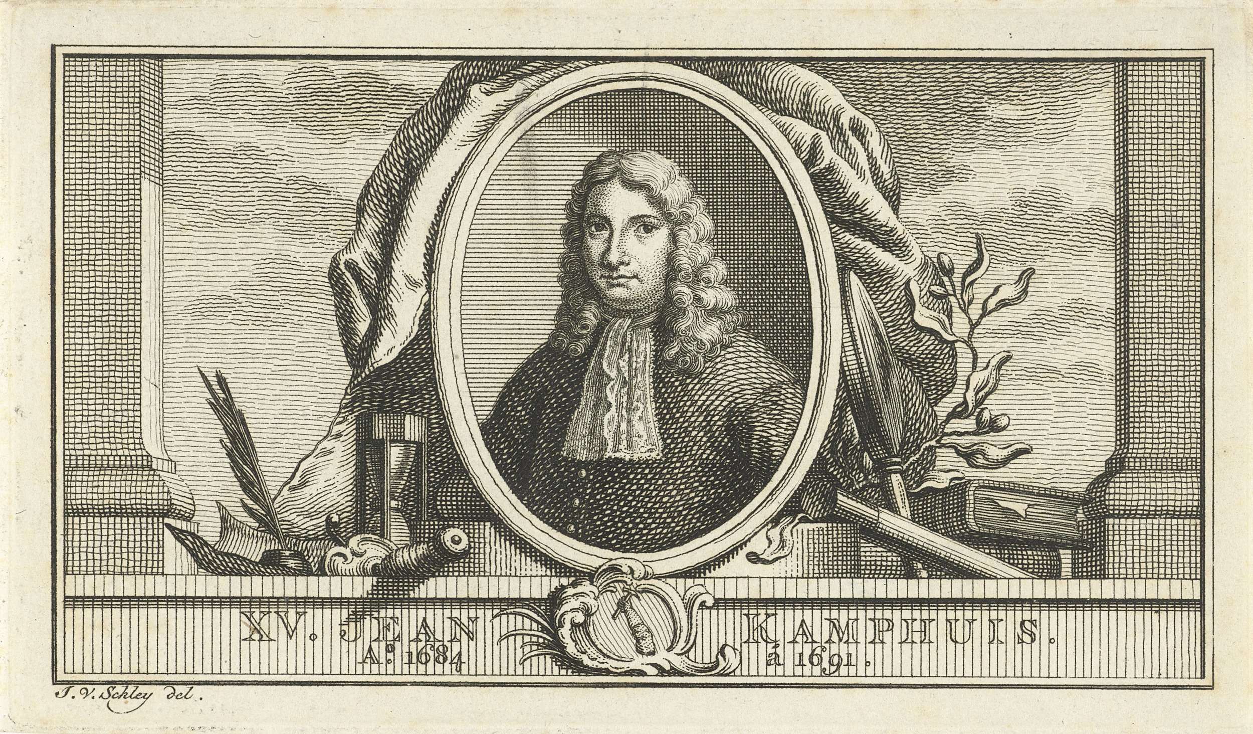 Portret van Johannes Camphuys, gouverneur-generaal van het voormalige Nederlands Oost-Indië van 1684 tot 1691. Naast het portret een zandloper, een stapel boeken en schrijfgerei, een commandostaf en een olijftak.