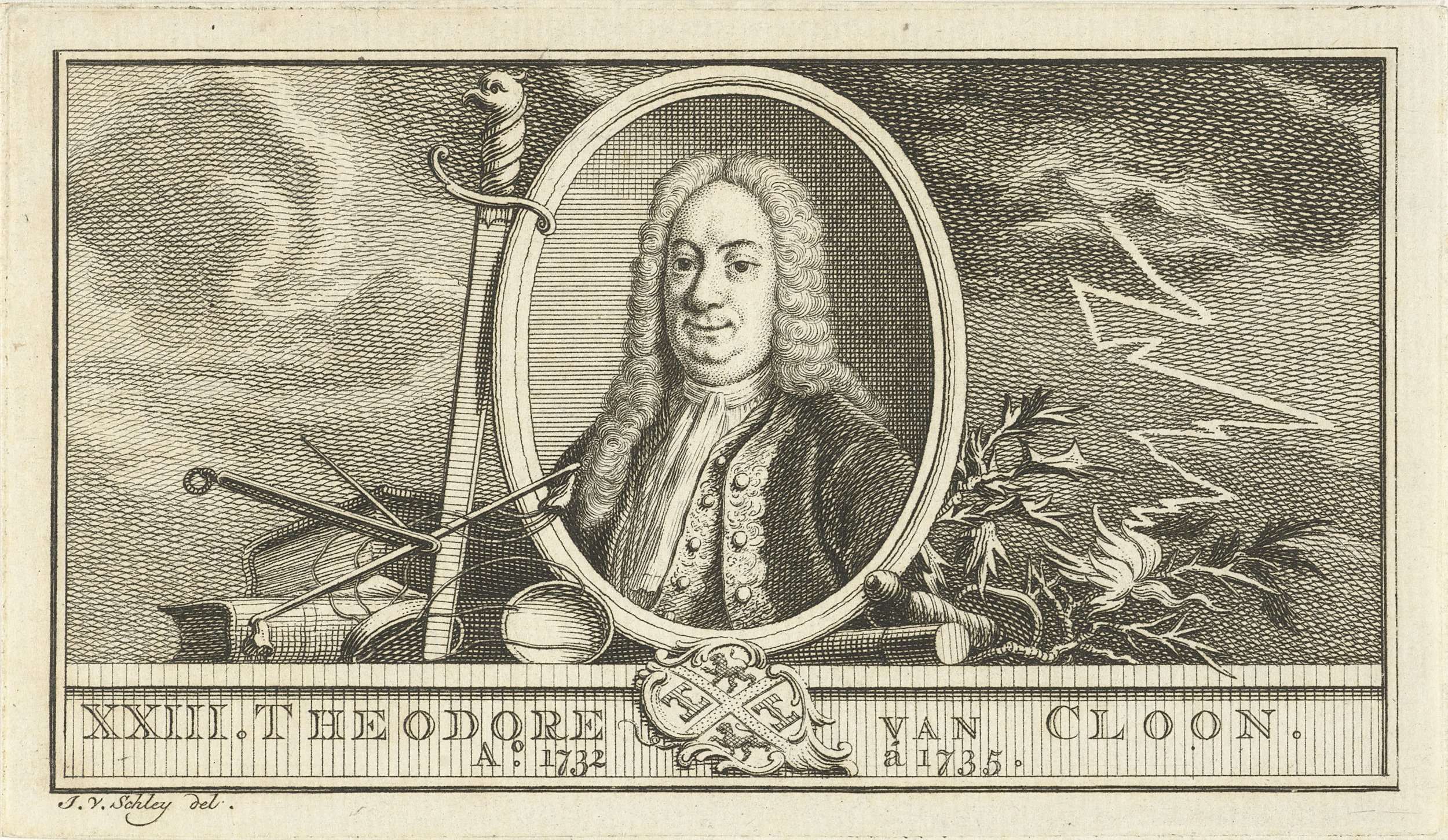 Portret van Dirck Cloon, gouverneur-generaal van het voormalige Nederlands Oost-Indië van 1732 tot 1735. Naast zijn portret, een weegschaal, boeken en verdorde takken. Vanuit de hemel slaat de bliksem in.
