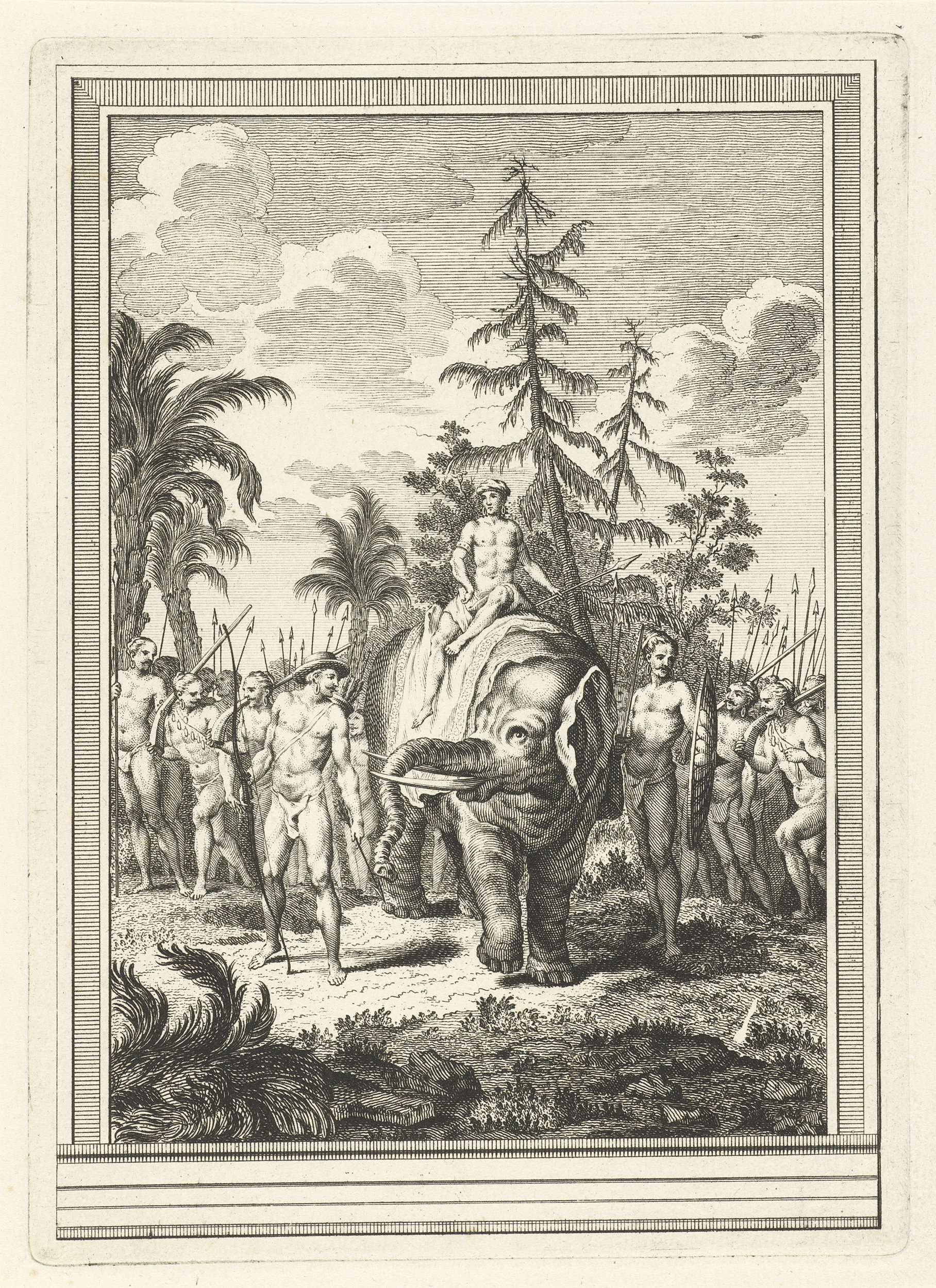 Een groep mannen met oorringen, snorren en speren en een olifant in een tropisch landschap. Een van de mannen zit op het dier.