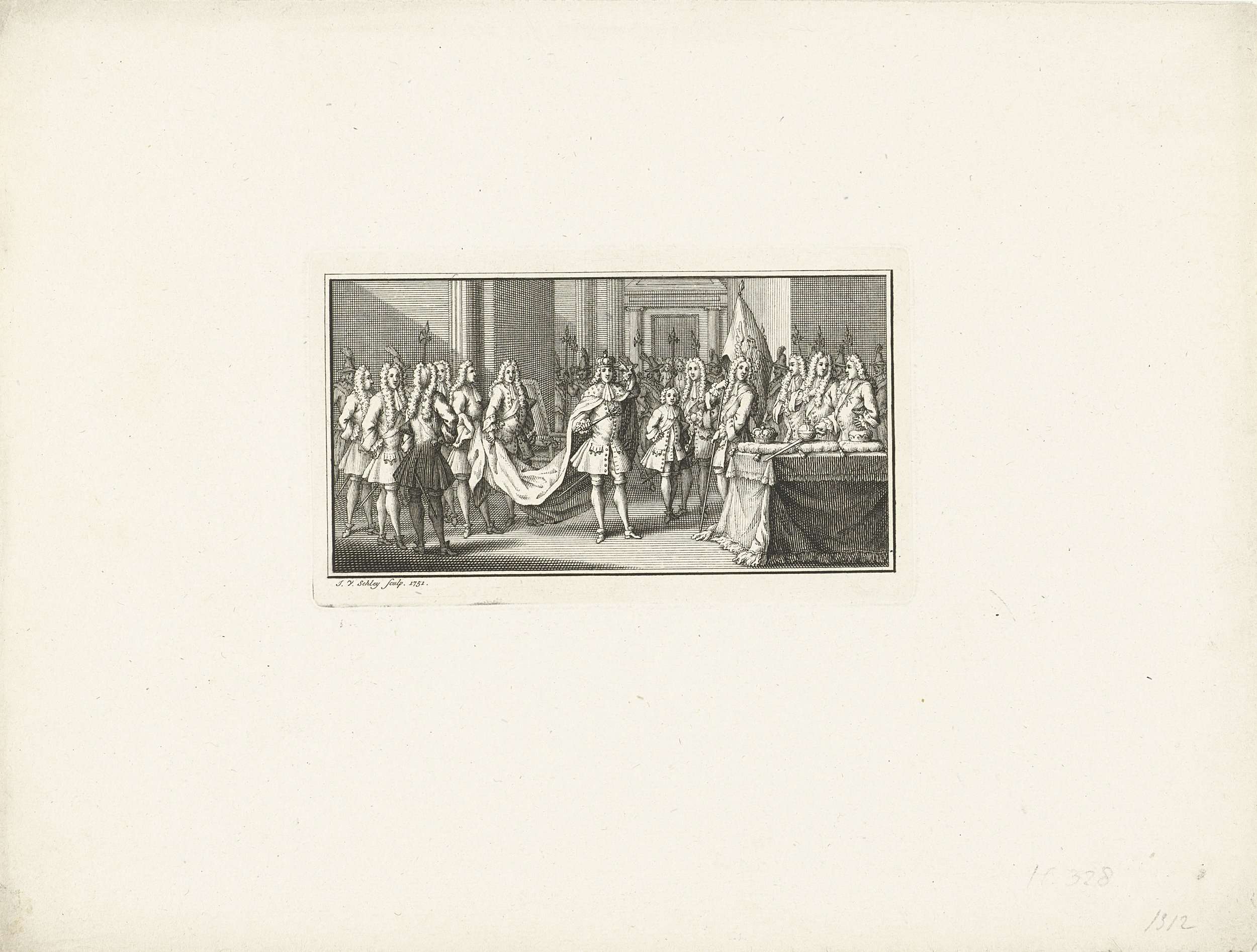 In een vertrek staat een koning voor een tafel waarop twee kronen en de rijksappel op kussens liggen. In het vertrek staan vele mannen en naast de tafel staan een man met een zwaard en een man met een vlag.