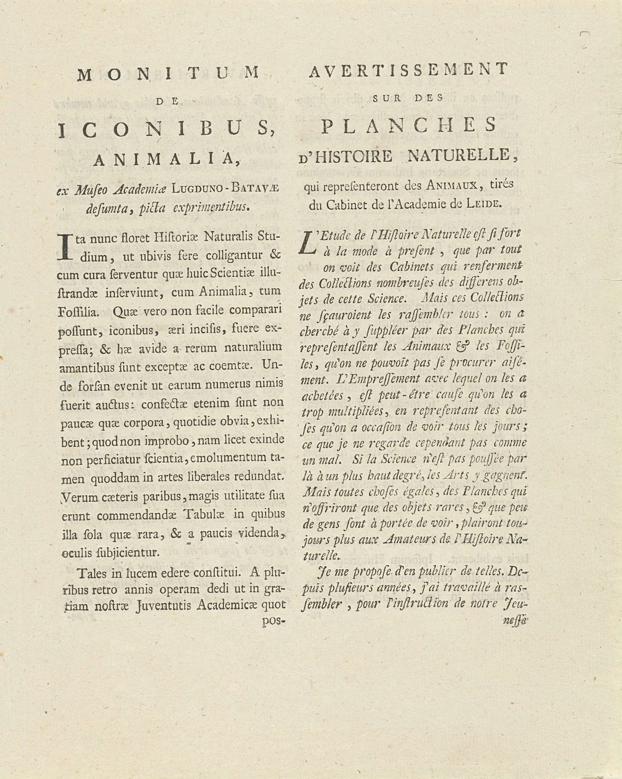 Avertissement sur des Planches D'Histoire Naturelle, qui representeront des Animaux, tirés du cabinet de l'Academie de Leide