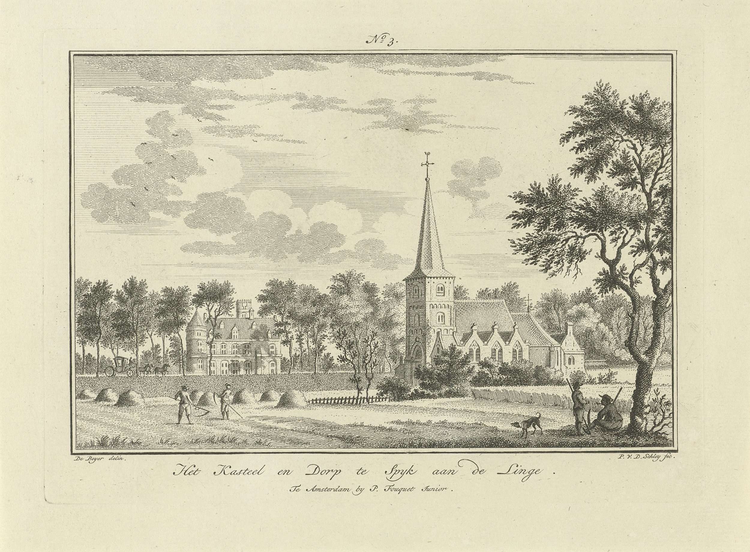 Gezicht op het kasteel en de kerk te Spijk (Lingewaal), met op de voorgrond enkele landarbeiders die op een akker werken. Op de dijk voor het kasteel rijdt een koets.