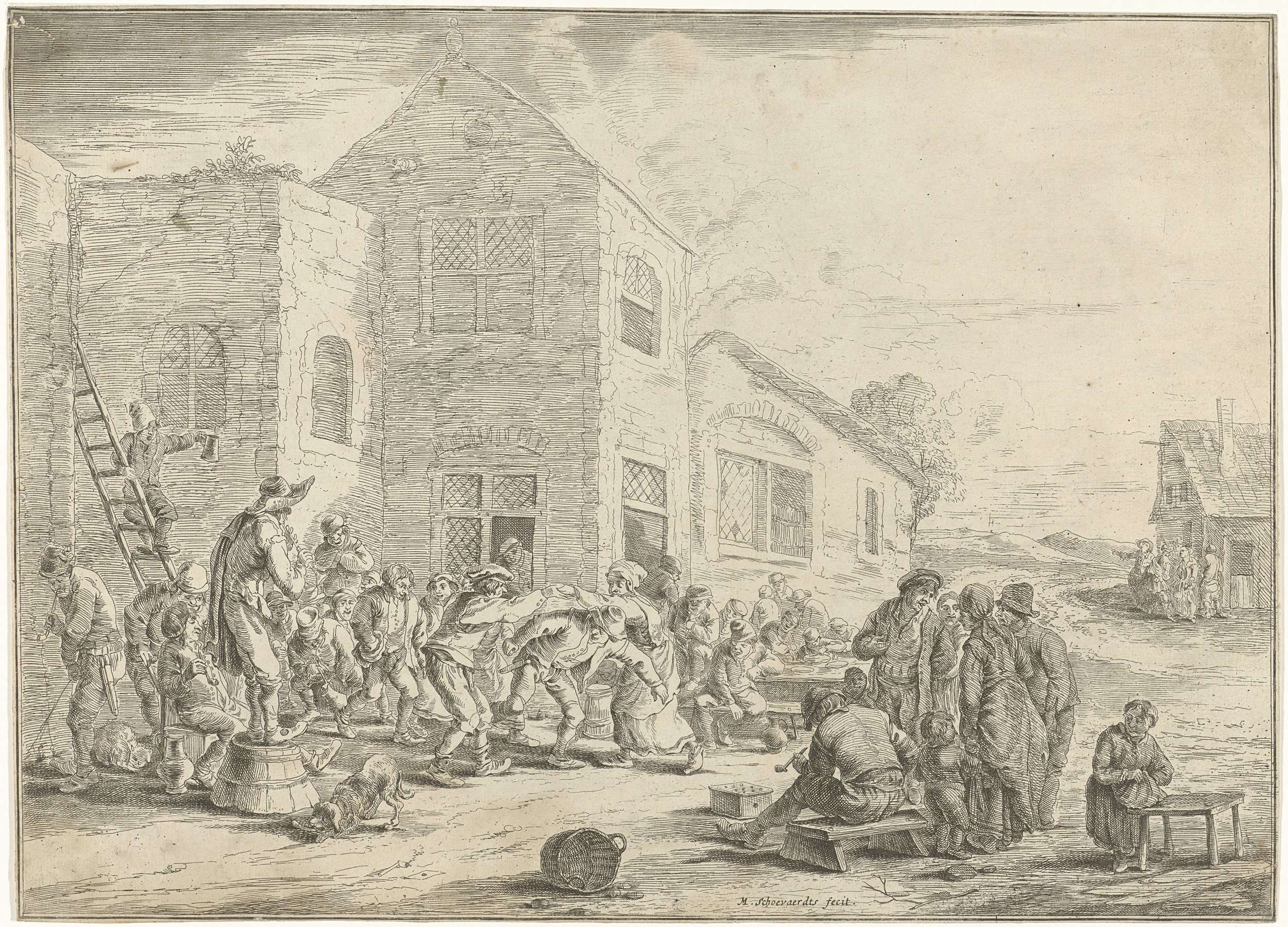Bij een herberg staat een klarinetspeler op een ton te spelen voor een groep boeren. Enkele boeren dansen, anderen roken, eten en drinken of voeren een gesprek.