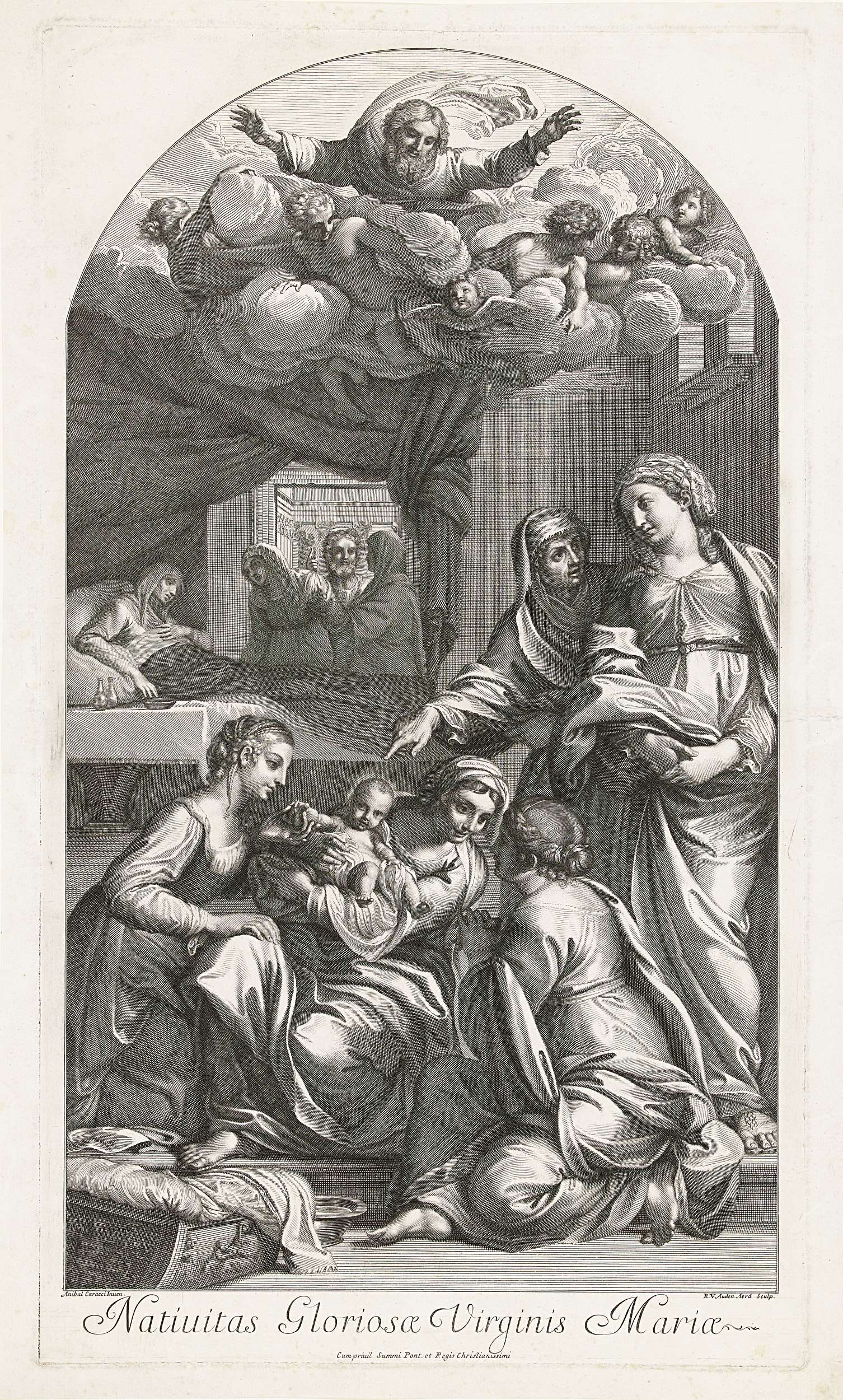 De heilige Anna ligt na de bevalling van haar dochter Maria op bed. Vijf dienstmaagden bekommeren zich om het net geboren kindje. Een oudere maagd wijst naar het kind en vertelt een ander iets. In de deuropening van Annas kamer is Marias vader de heilige Joachim te zien. Vanuit de hemel kijkt God de Vader ...