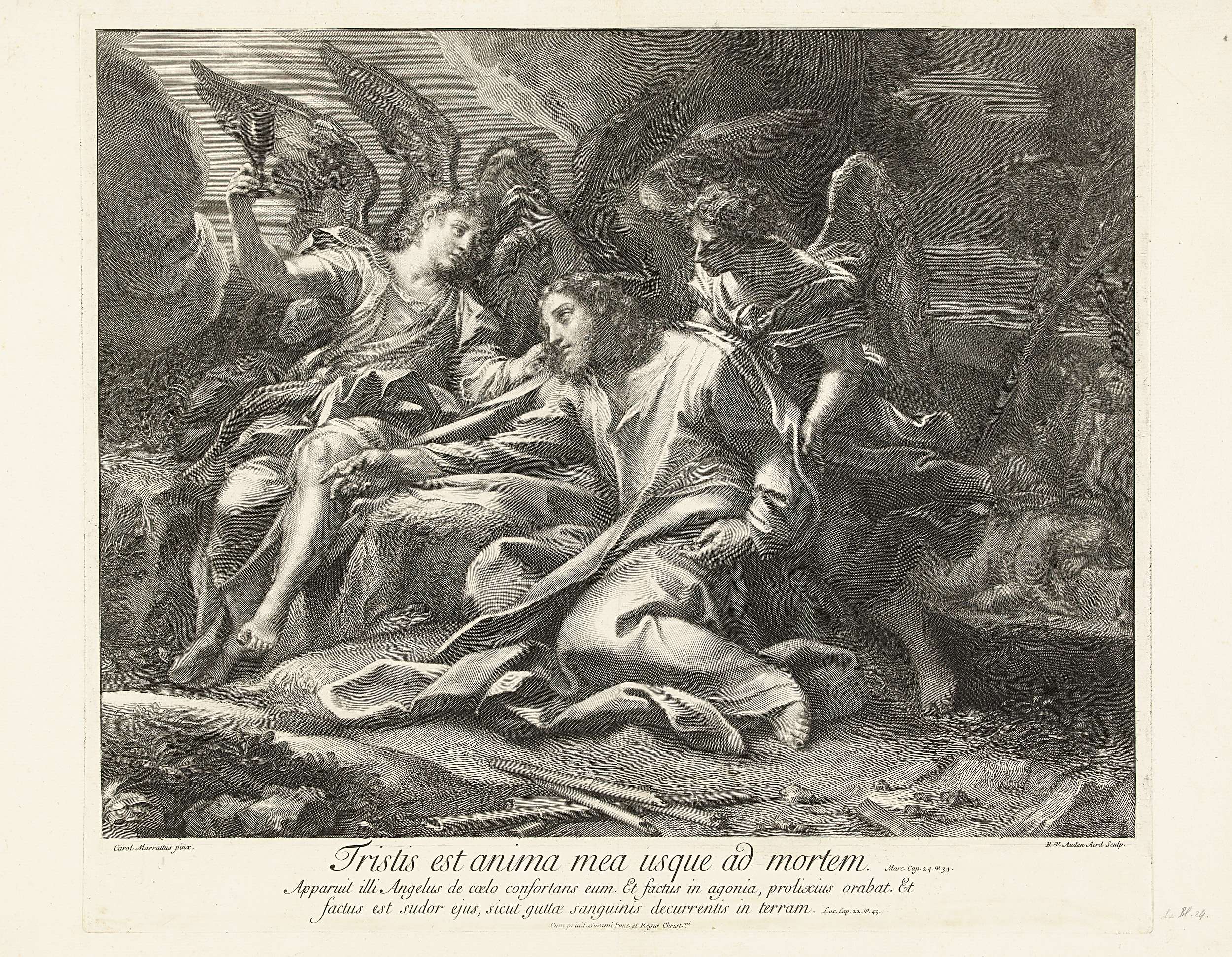 Christus trekt zich met Petrus, Jakobus en Johannes terug op de Olijfberg om te bidden. Hij is bang voor wat er de komende tijd gaat gebeuren. Een engel brengt hem een beker om weer op krachten te komen. Op de achtergrond zijn twee van de drie discipelen die hij had meegevraagd om voor hem te ...