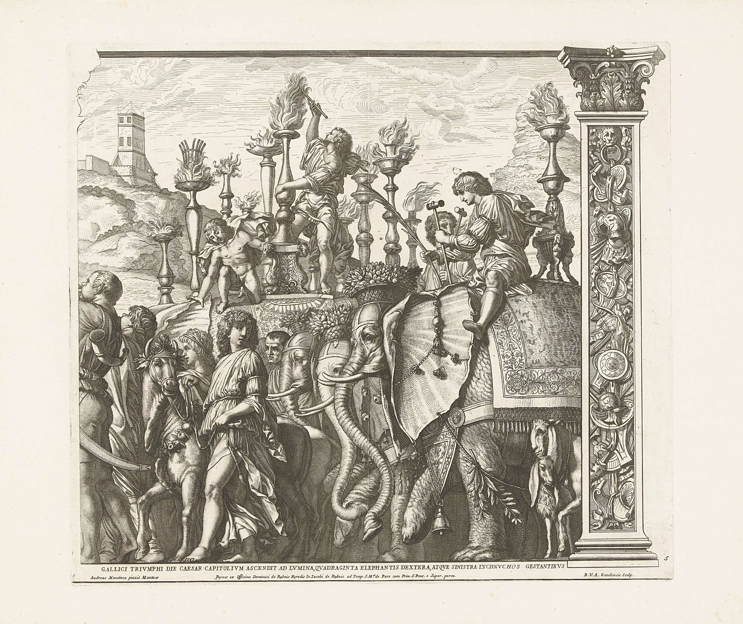 In de triomftocht ter ere van Julius Caesar lopen ook olifanten mee. De olifanten dragen elk een kandelaar met vuur op hun rug en een mand met bloemen en fruit op hun hoofd. Ze zijn versiert met rijk geborduurde kleden en kettingen met belletjes.