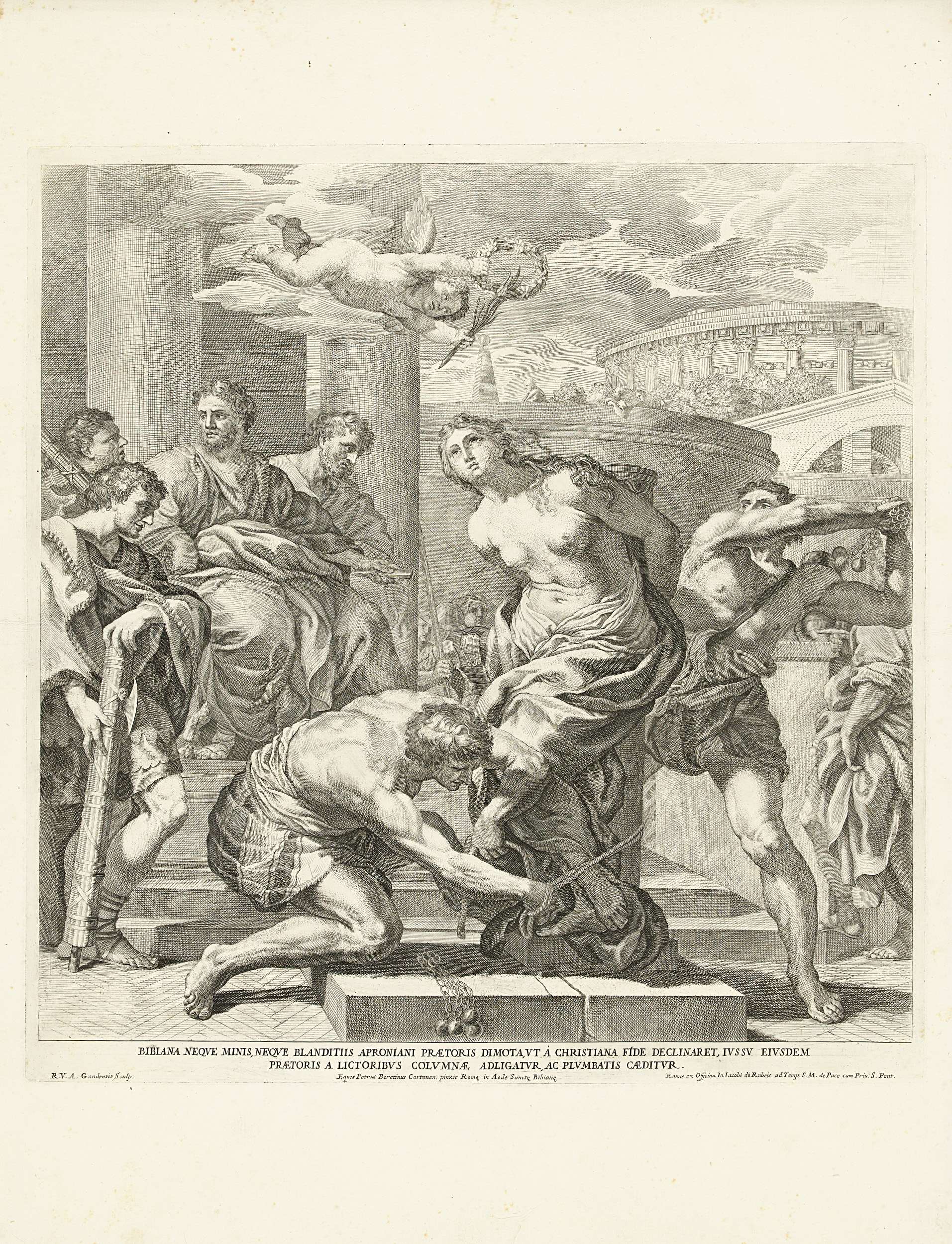 Bibiana die zich blijft verzeten tegen de Romeinse gouverneur Apronianus wordt aan een zuil vastgebonden en gemarteld.