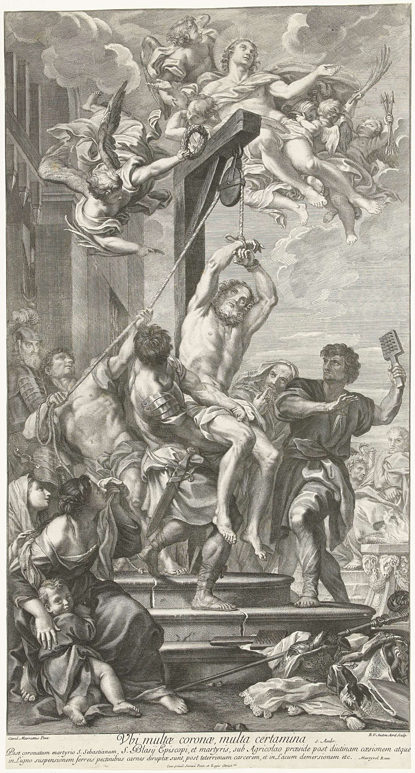 De heilige Blasius wordt gemarteld. Hij hangt aan een galg terwijl een man met een ijzeren kam op hem inslaat. Zijn bisschopsstaf, mijter en mantel liggen op de grond. Vrouwen en kinderen kijken met schik naar wat er gebeurd. De engel die om de galg zweven dragen alvast het kenmerk van de martelaar, een palmtak, ...