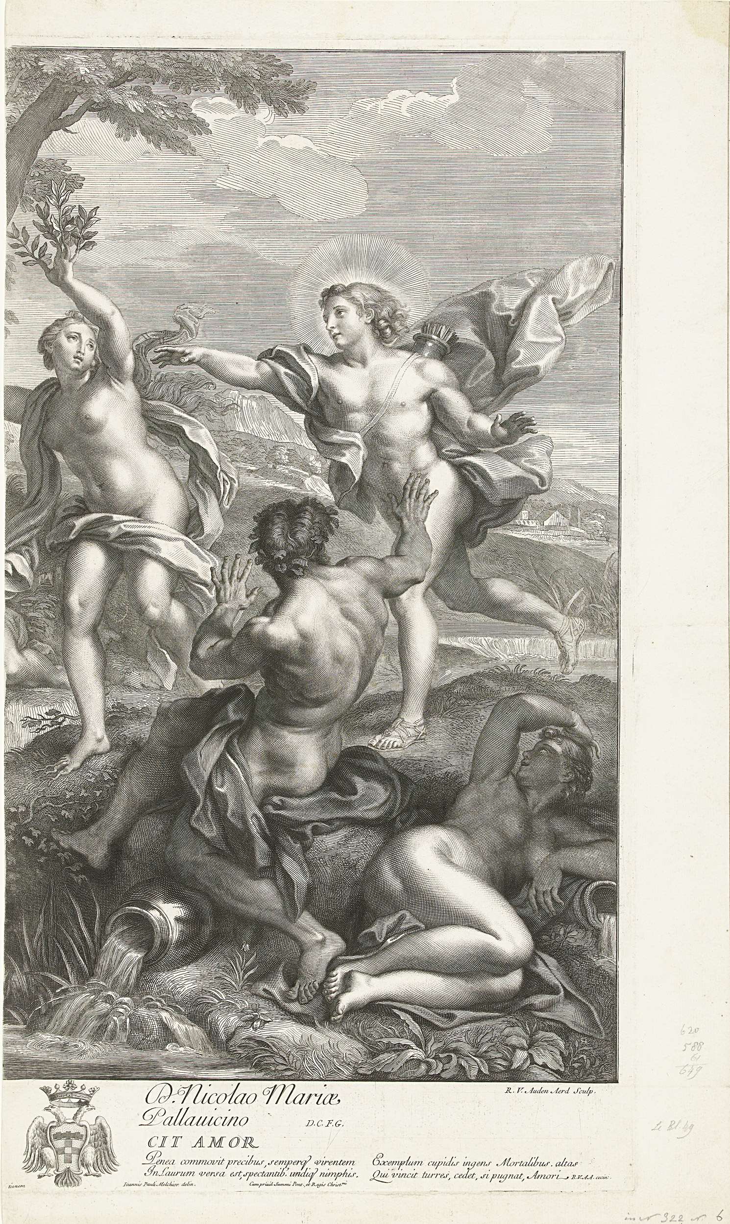 Apollo, door een van Amors pijlen getroffen, achtervolgd de nimf Daphne. Die roept haar vader om hulp en vervolgens veranderd ze in een laurierboom. Uit haar vingers sprieten al de bladeren. Een riviergod en een nimf die aan de oever van een rivier liggen zien het geheel gebeuren.