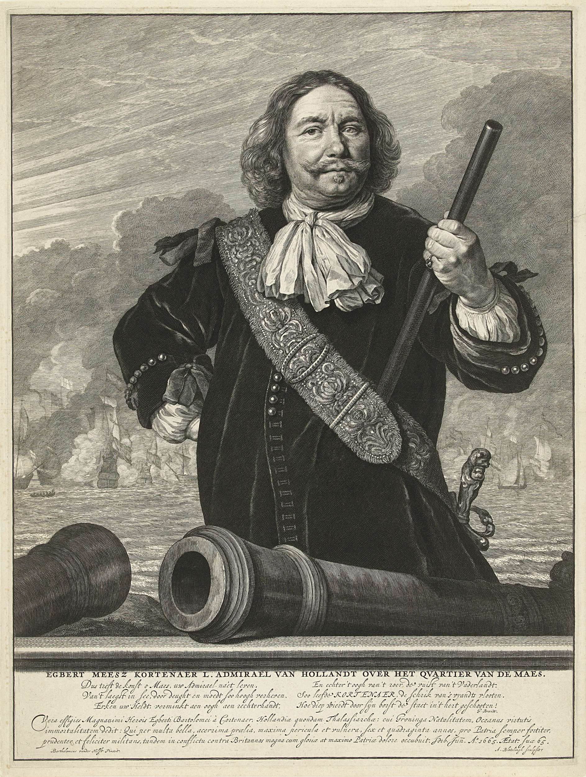 Portret van admiraal Egbert Meeuwisz. Kortenaer. Kortenaer was een luitenant-admiraal die zich vooral in de Engelse oorlogen had bewezen. Tijdens de zogenoemde slag bij de Singels raakte hij gewond en verloor een hand en een oog. Deze verwondingen versterkten juist zijn heldenstatus en in het lofdicht onder de prent wordt ook hiernaar verwezen. Kortenaer staat ...