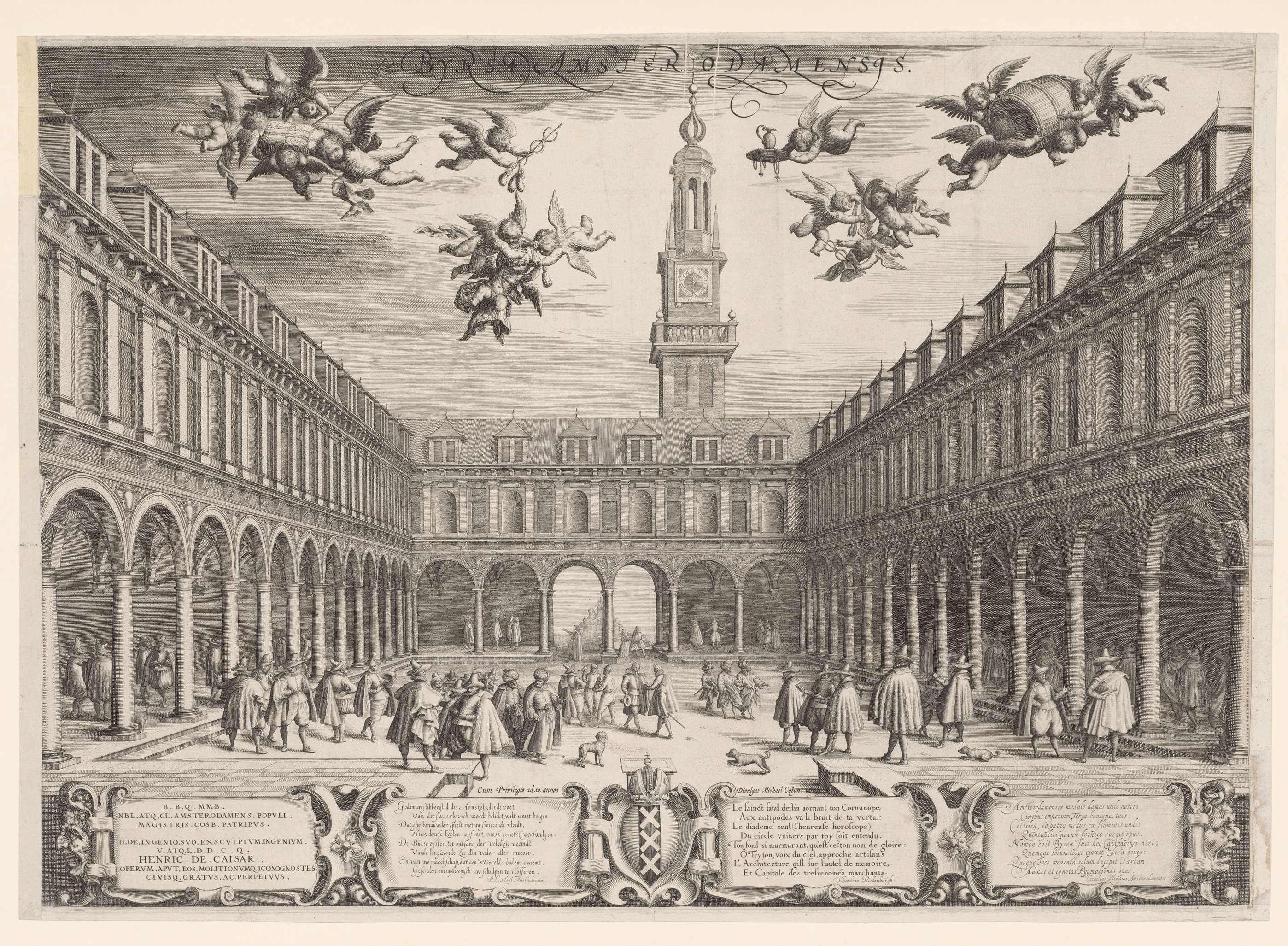 Binnenplaats van de beurs van Hendrik de Keyser in Amsterdam in 1609. Met kooplieden uit binnen- en buitenland. In de lucht engelen met attributen van de handel en welvaart. Middenonder het wapen van Amsterdam en vier cartouches met een Latijnse tekst en gedichten van P.C. Hooft, T. Rodenburgh en C. Plemp in respectievelijk Nederlands, Frans ...