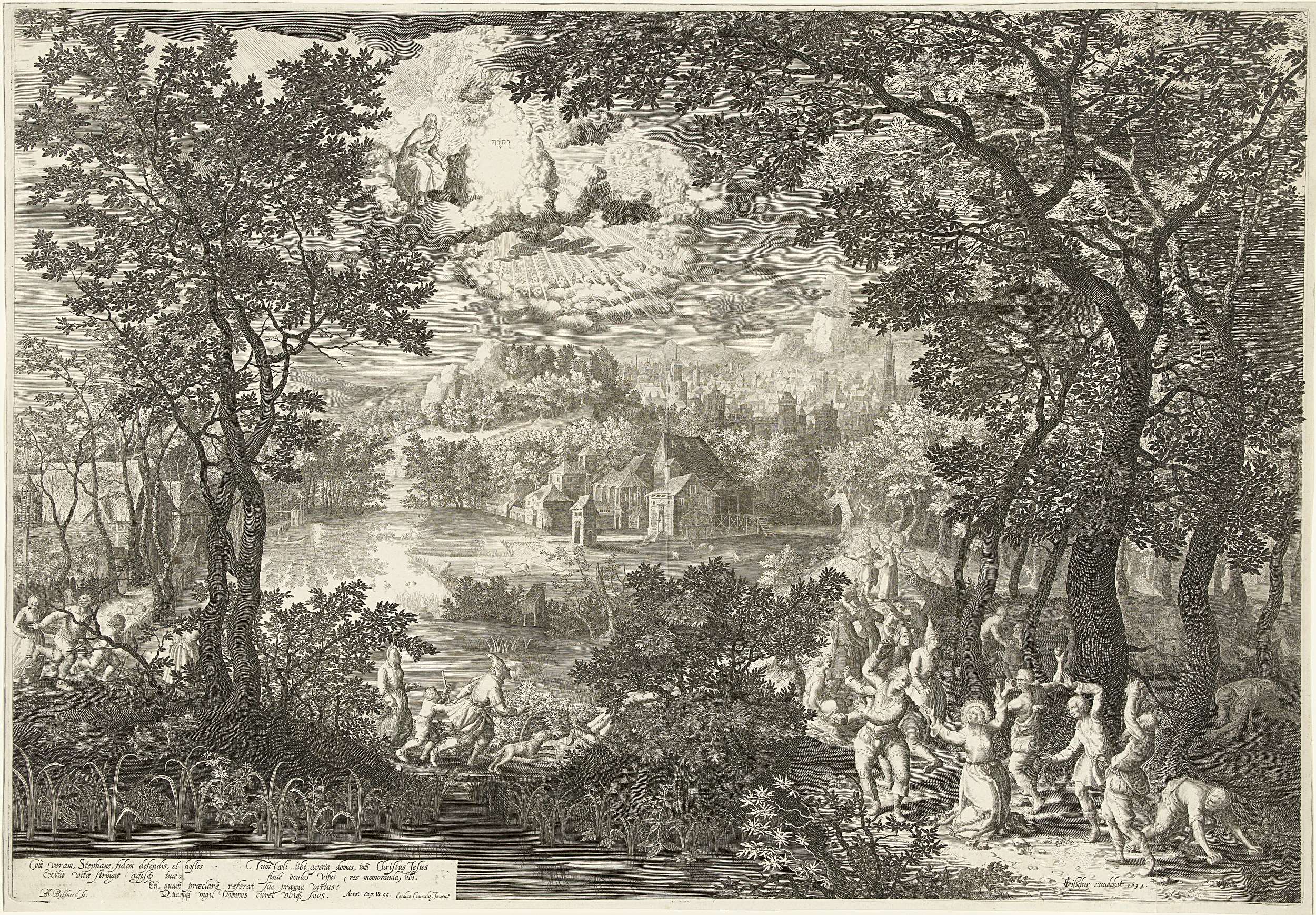 Landschap met martelaarschap van de heilige Stefanus waarbij hij gestenigd wordt door een menigte die hem achtervolgt. Linksonder bijbeltekst in zes regels Latijn uit Handelingen 7:55.