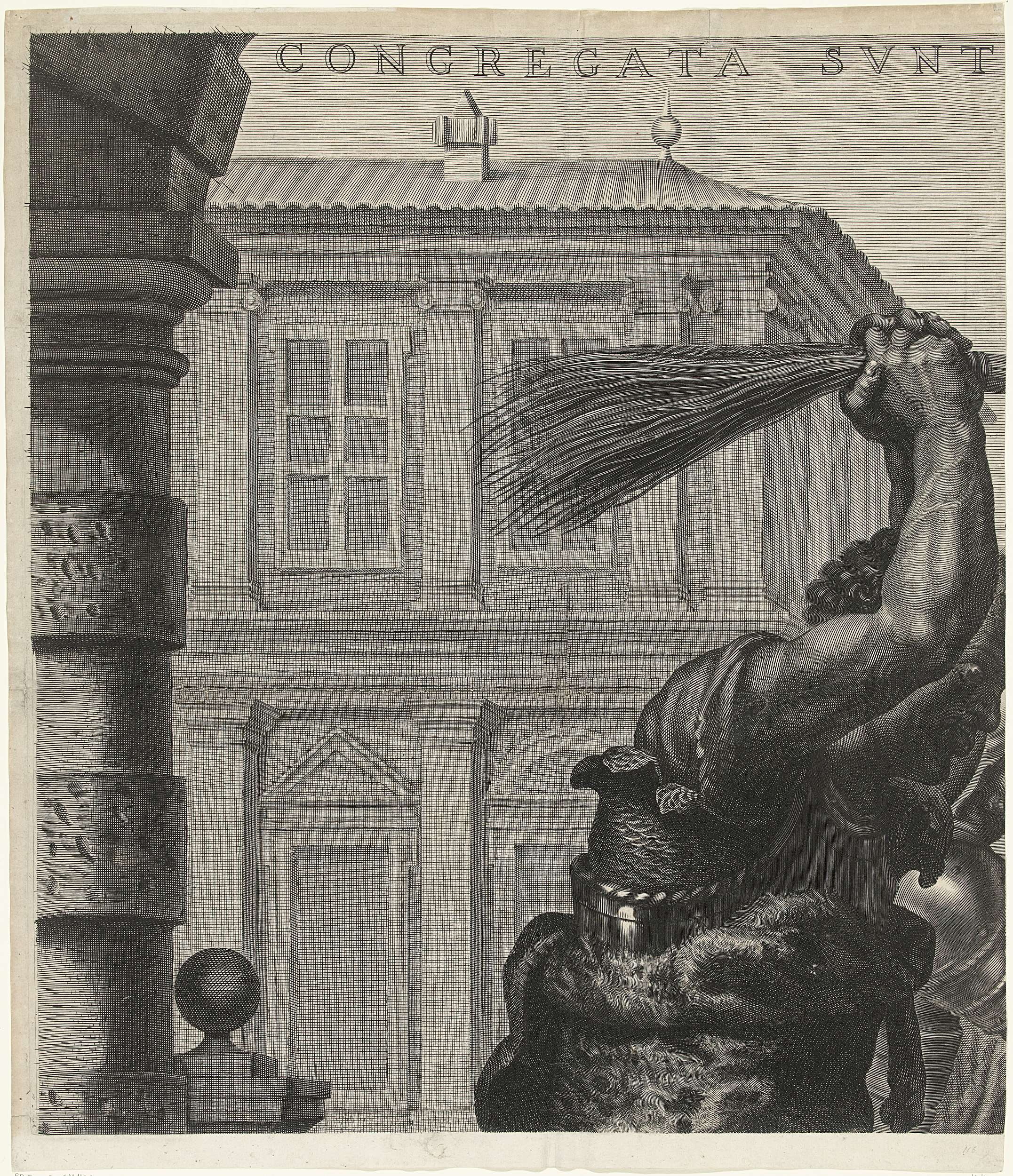 In het midden van de prent staat Christus. Hij wordt door twee mannen gegeseld. Een man heeft een roede vast, de ander een zweep met knopen. Twee andere mannen houden Christus in bedwang. Rechts van de prent kijkt Pilatus toe. Op de achtergrond de Farizeeën en schriftgeleerden, die van op afstand de marteling volgen. De ...