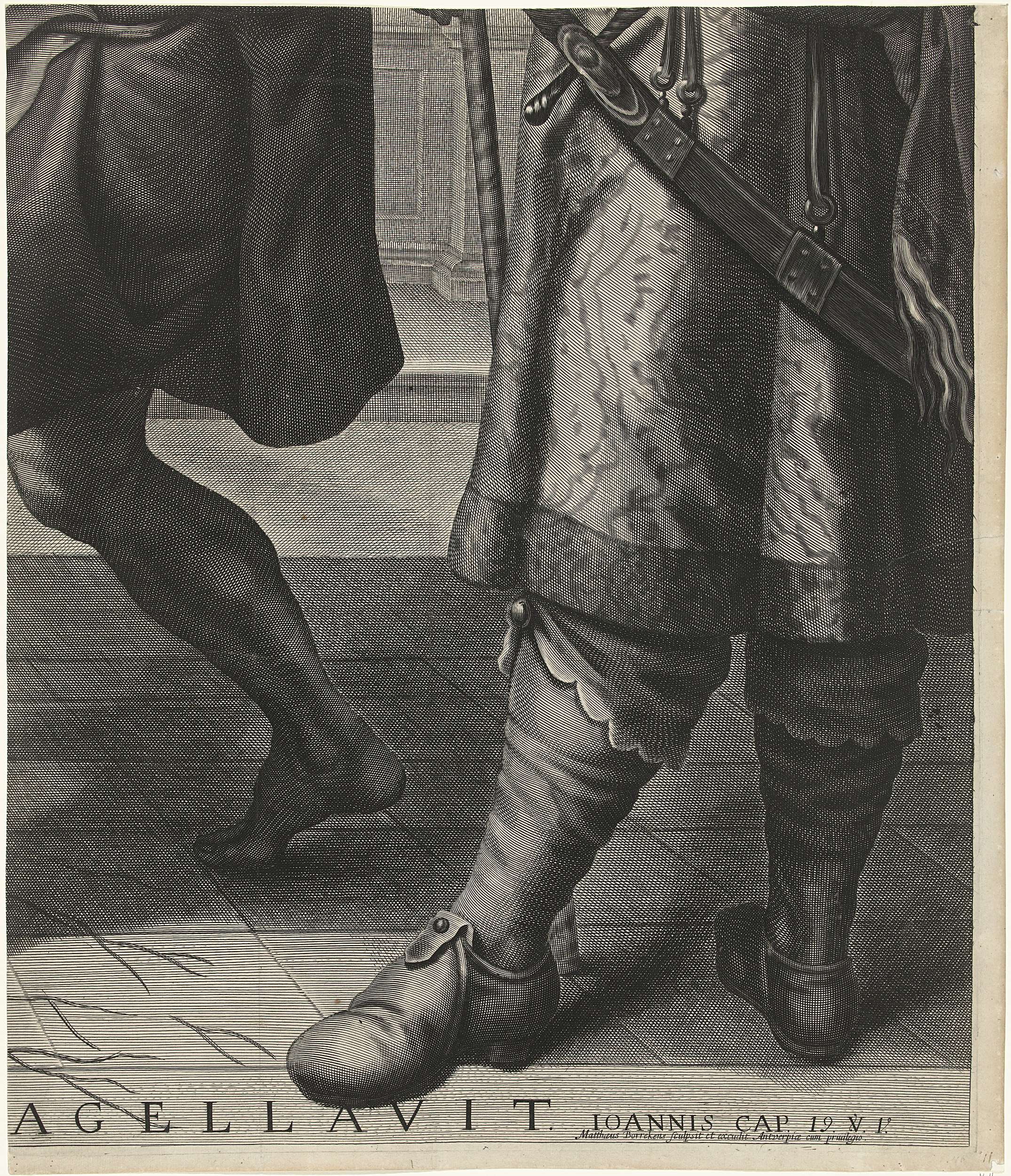 In het midden van de prent staat Christus. Hij wordt door twee mannen gegeseld. Een man heeft een roede vast, de ander een zweep met knopen. Twee andere mannen houden Christus in bedwang. Rechts van de prent kijkt Pilatus toe. Op de achtergrond de Farizeeën en schriftgeleerden, die van op afstand de marteling volgen. De ...