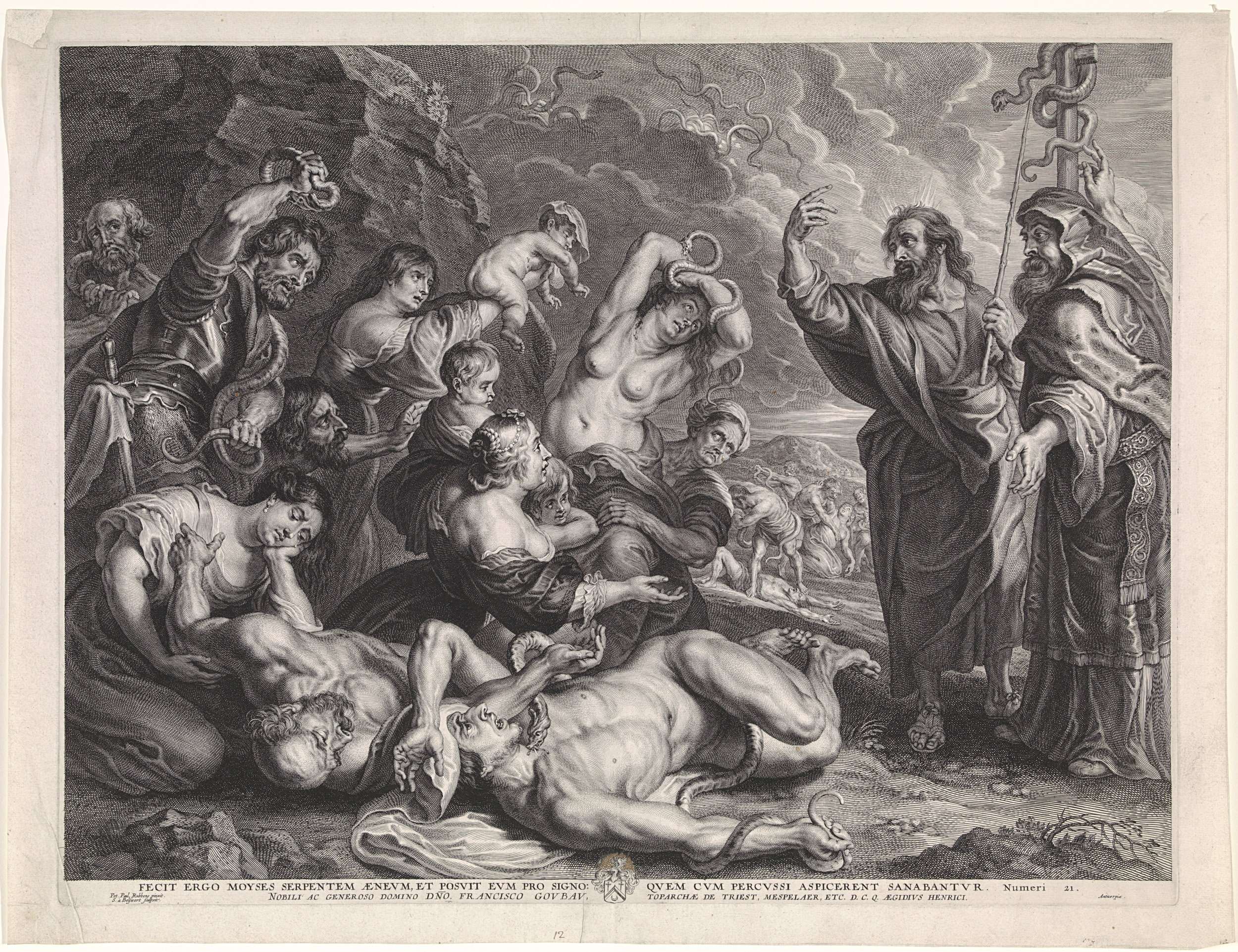 Rechts staan Aäron en Mozes naast de op een staak bevestigde koperen slang. Mannen, vrouwen en kinderen, die door giftige slangen worden gebeten kijken naar de koperen slang om in leven te blijven. Onder de voorstelling de titel in het Latijn en een verwijzing naar de Bijbeltekst in Num. 21.