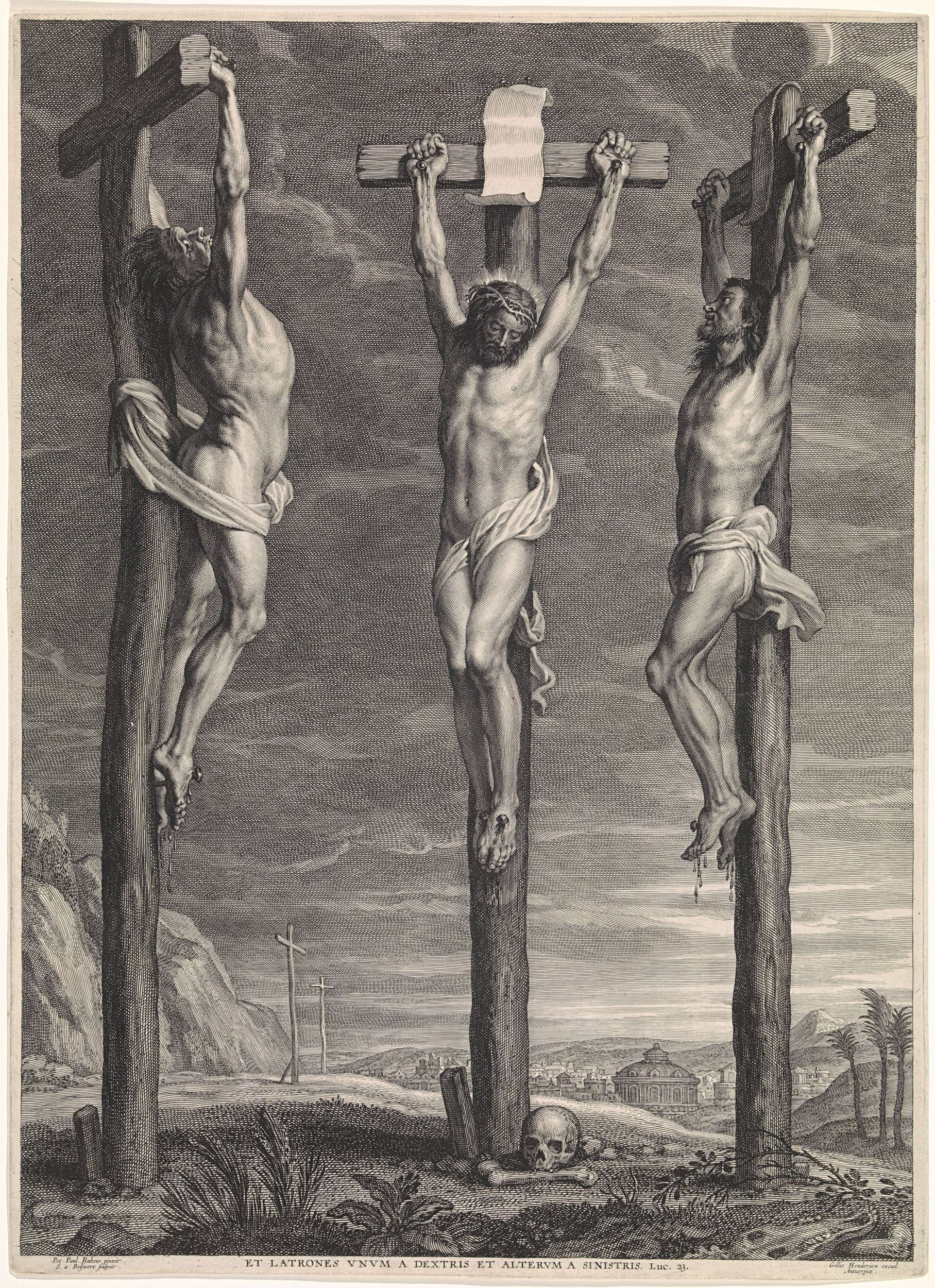 Christus aan het kruis tussen de twee gekruisigde misdadigers. In de marge staat een Latijnse bijbeltekst uit Lucas 23.