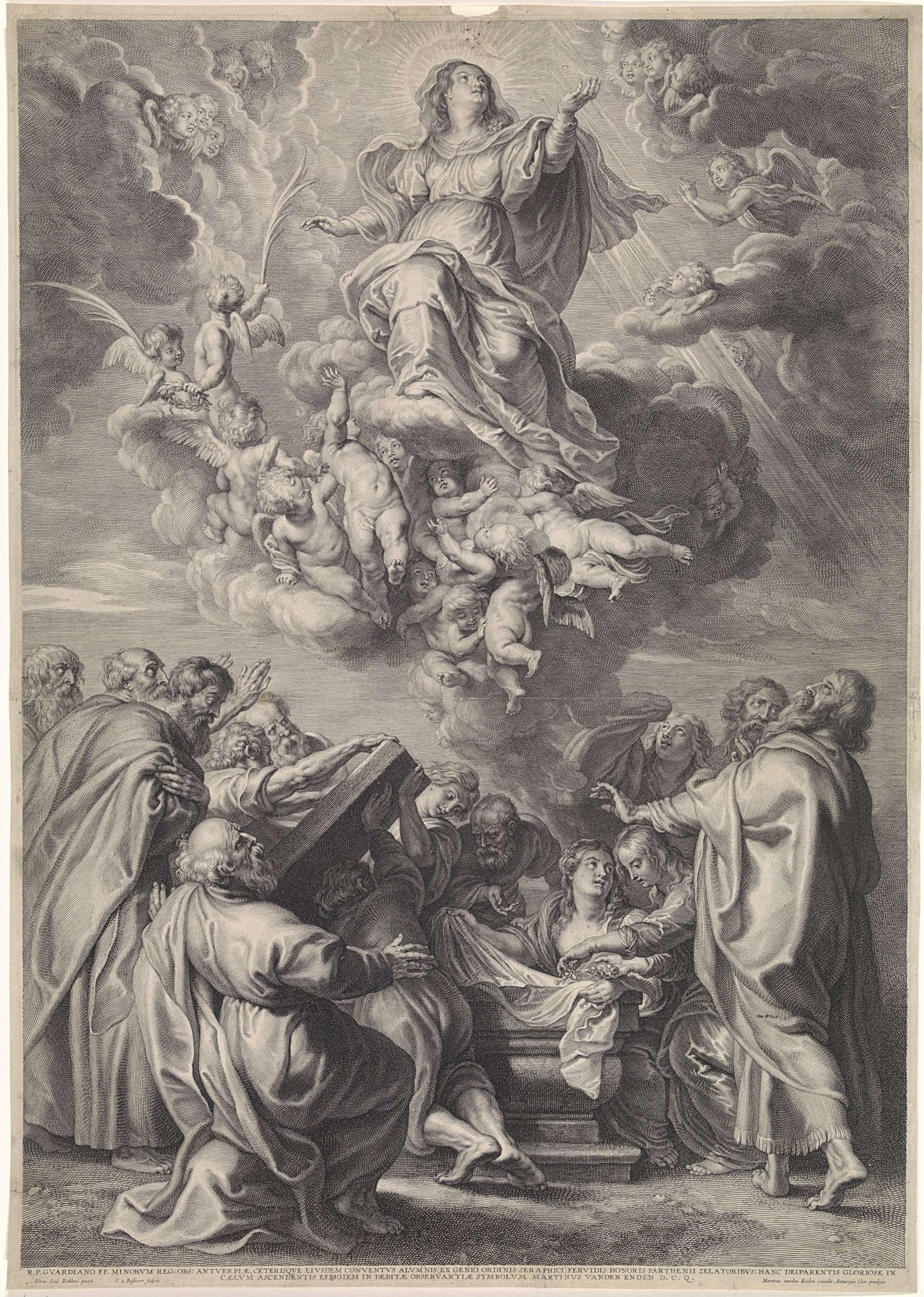 Hemelvaart van Maria met apostelen. In marge Latijns opschrift.