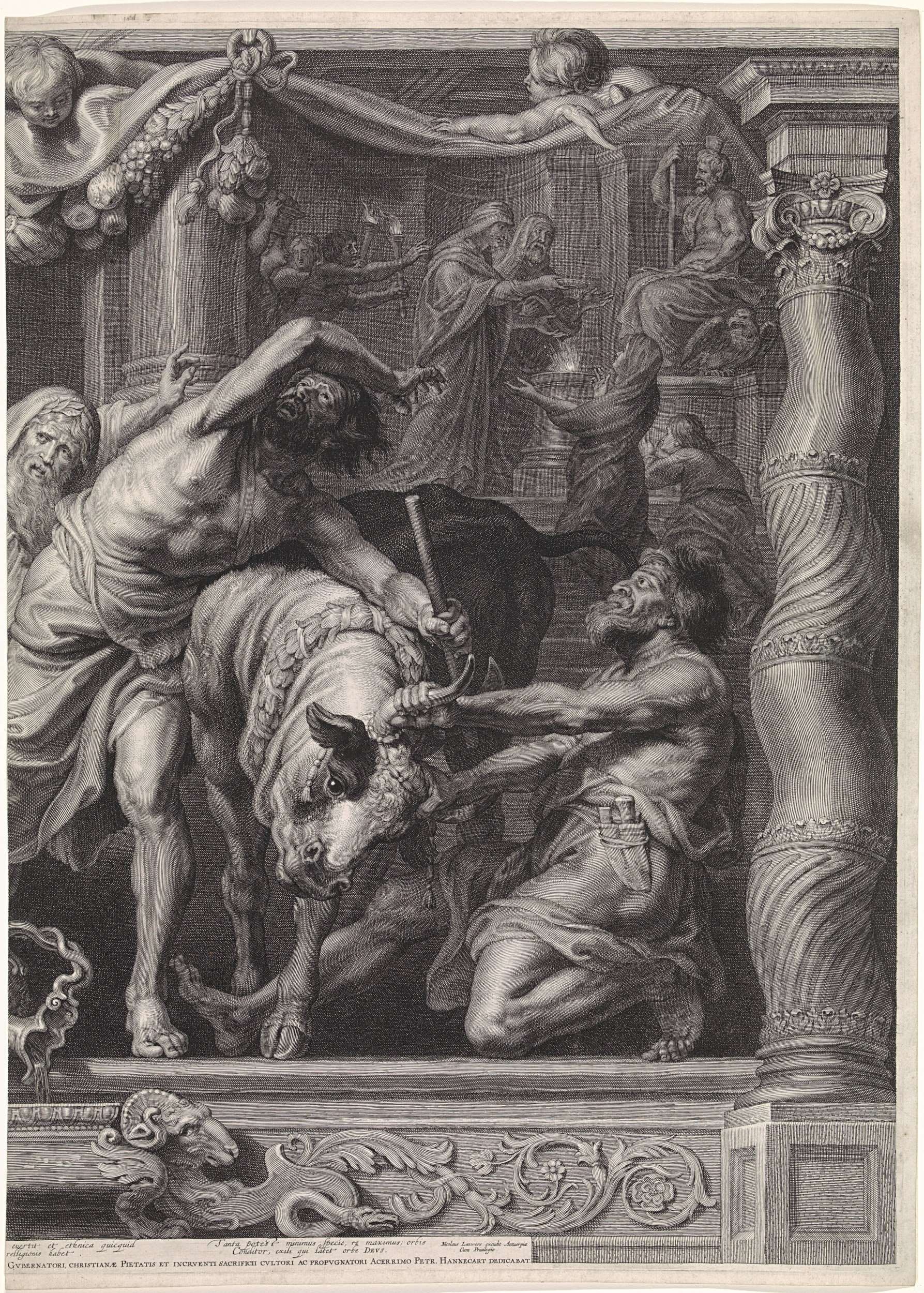 Mannen en vrouwen vereren de Griekse god Zeus bij altaren in een tempel, zij brengen offers zoals een jonge stier. Deze afgoderij wordt tot hun grote schrik verstoort door een engel die omringd door lichtstralen verschijnt en een kelk met hostie aan hen toont. Dit is het rechter blad van twee losse prenten welke een ...