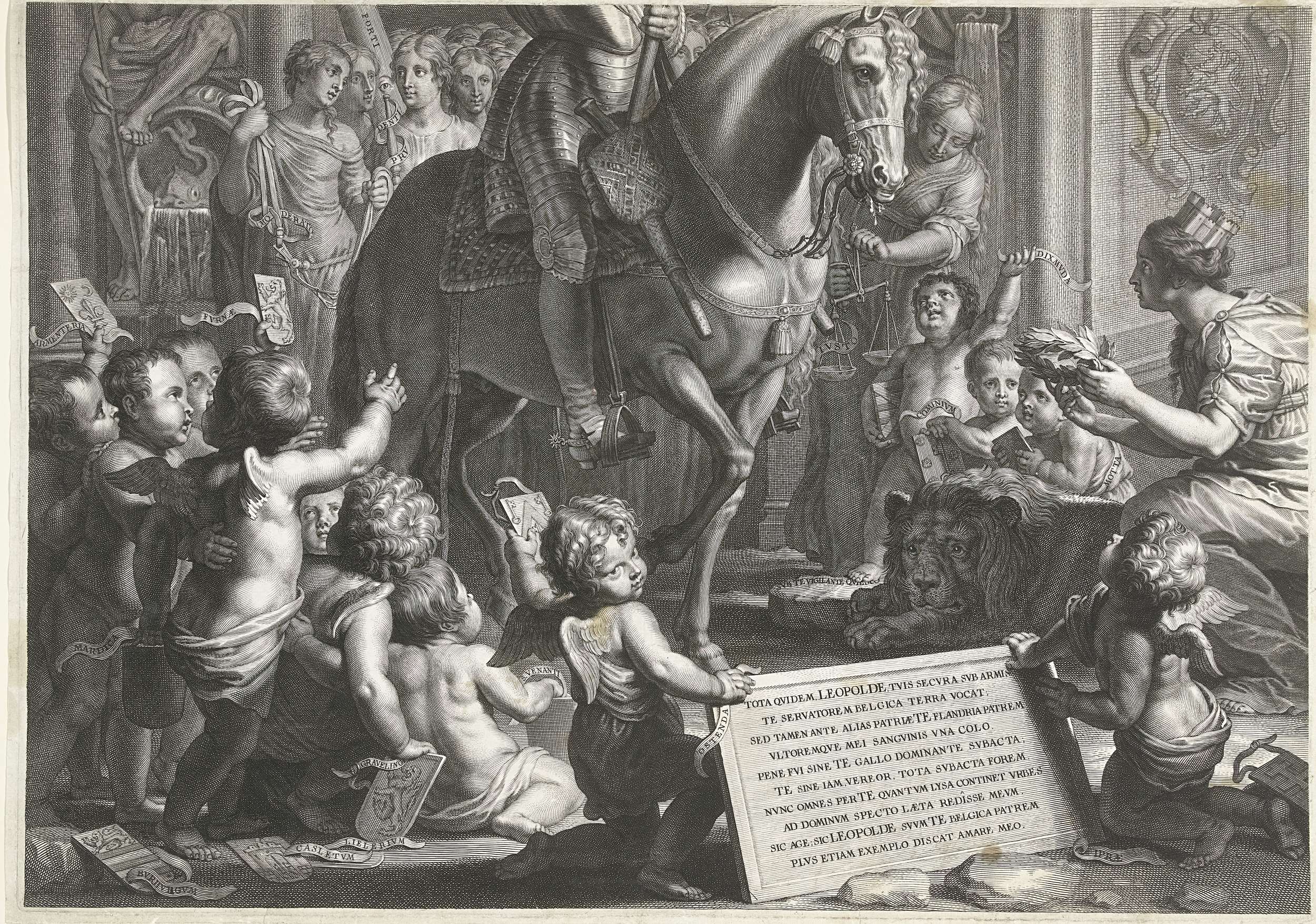 Intocht van Leopold Willem, landvoogd der Zuidelijke Nederlanden, te Gent. Prent bestaande uit vier delen. Dit is het deel linksonder. Putti met de wapenschilden van verschillende Vlaamse steden en gewesten ontvangen Leopold Willem enthousiast. De Gentse stedenmaagd knielt voor hem en houdt een lauwerkrans in haar hand om hem te lauweren. Achter het paard de ...