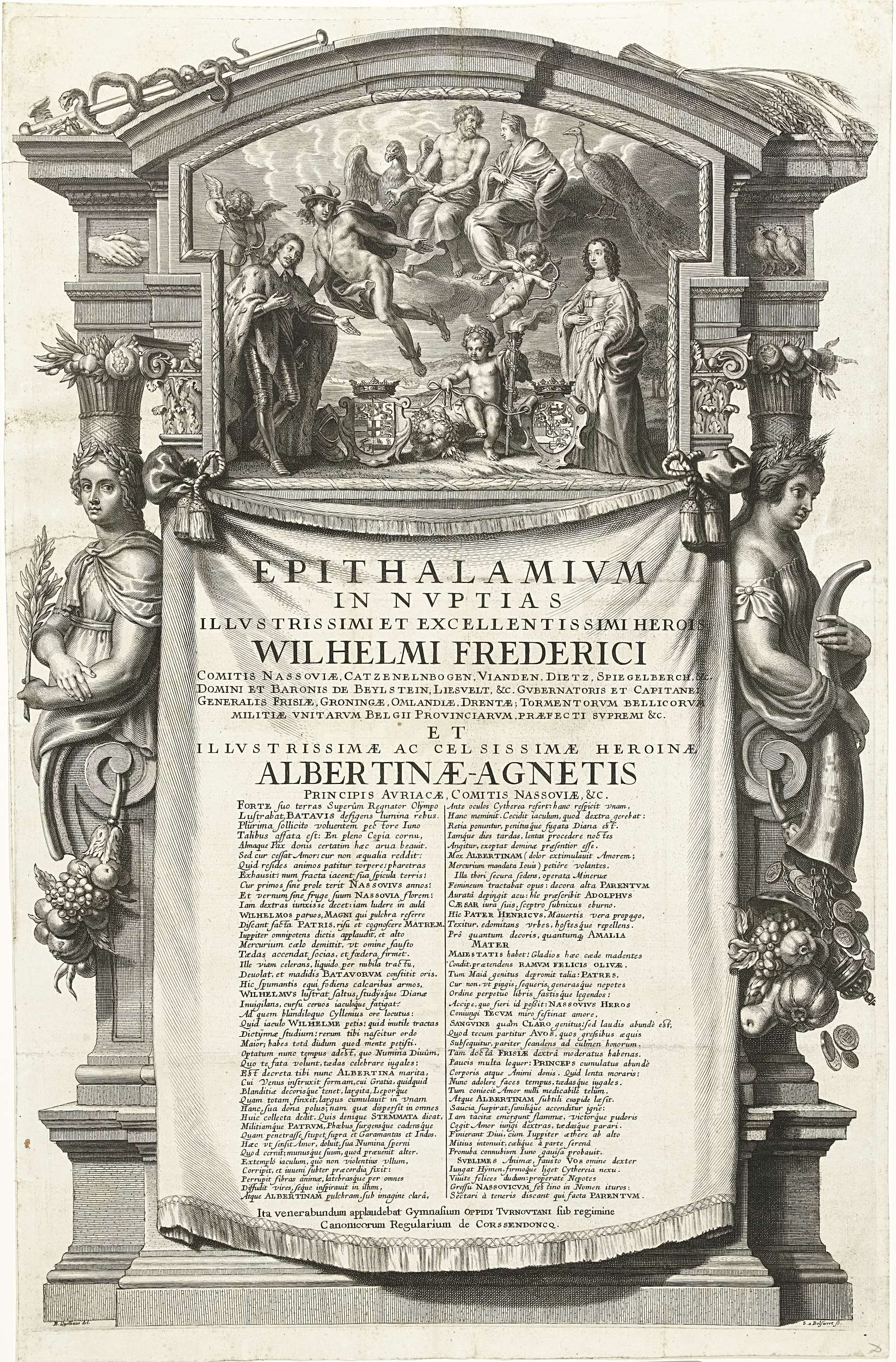 Mercurius brengt Willem Frederik naar Albertine Agnes. In het midden hun wapenschilden. In de hemel zitten Jupiter en Juno op een wolk met hun diersymbolen de adelaar en de pauw naast zich. Onder de voorstelling een gedicht ter ere van het huwelijk. In een architecturale ornamentele lijst met huwelijkssymbolen en twee kariatiden.