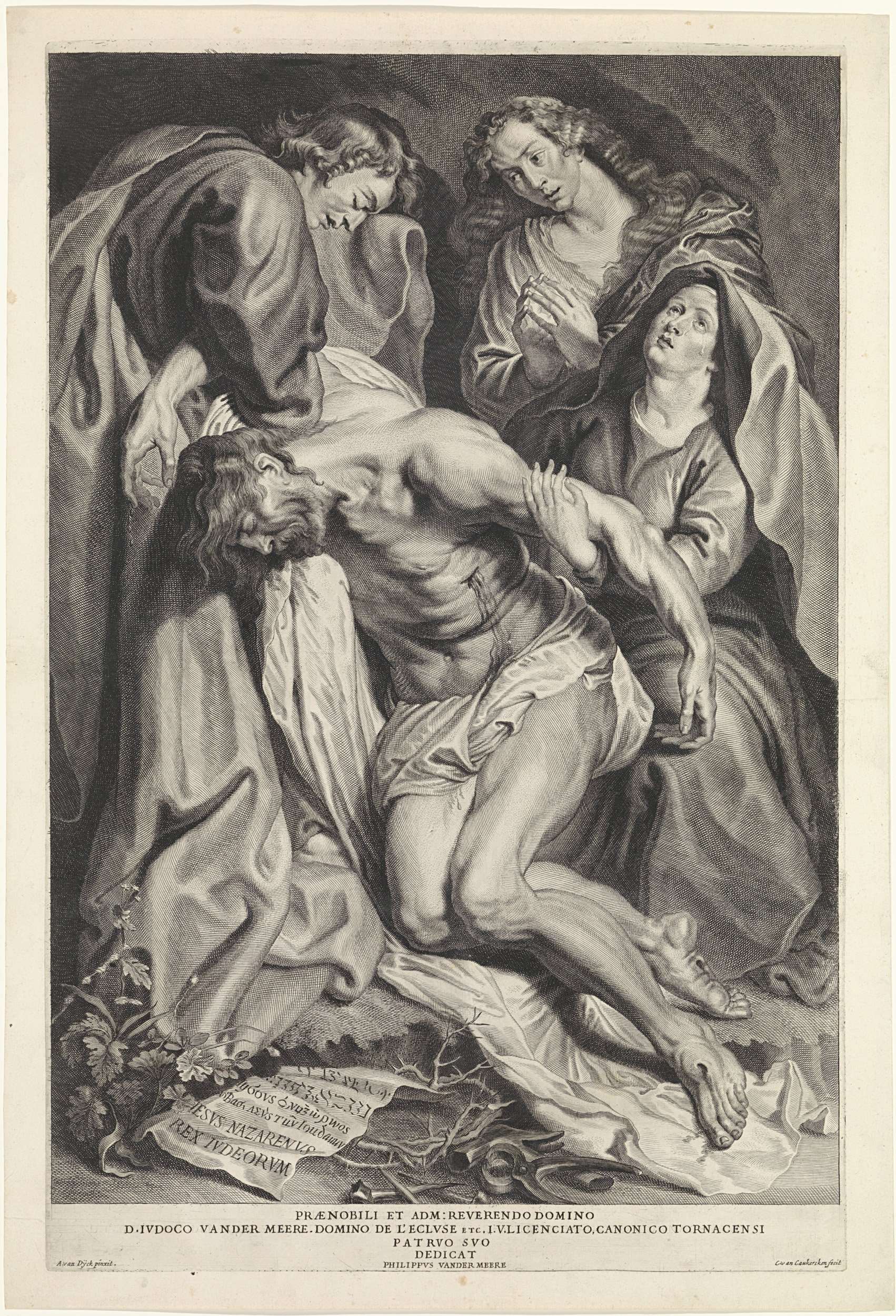 Maria en Jozef van Arimatea houden het lichaam van Christus vast. Johannes de evangelist heeft zijn handen gevouwen om te bidden. Maria weent om haar dode zoon. Op de grond de doornenkroon en de tang en spijkers.