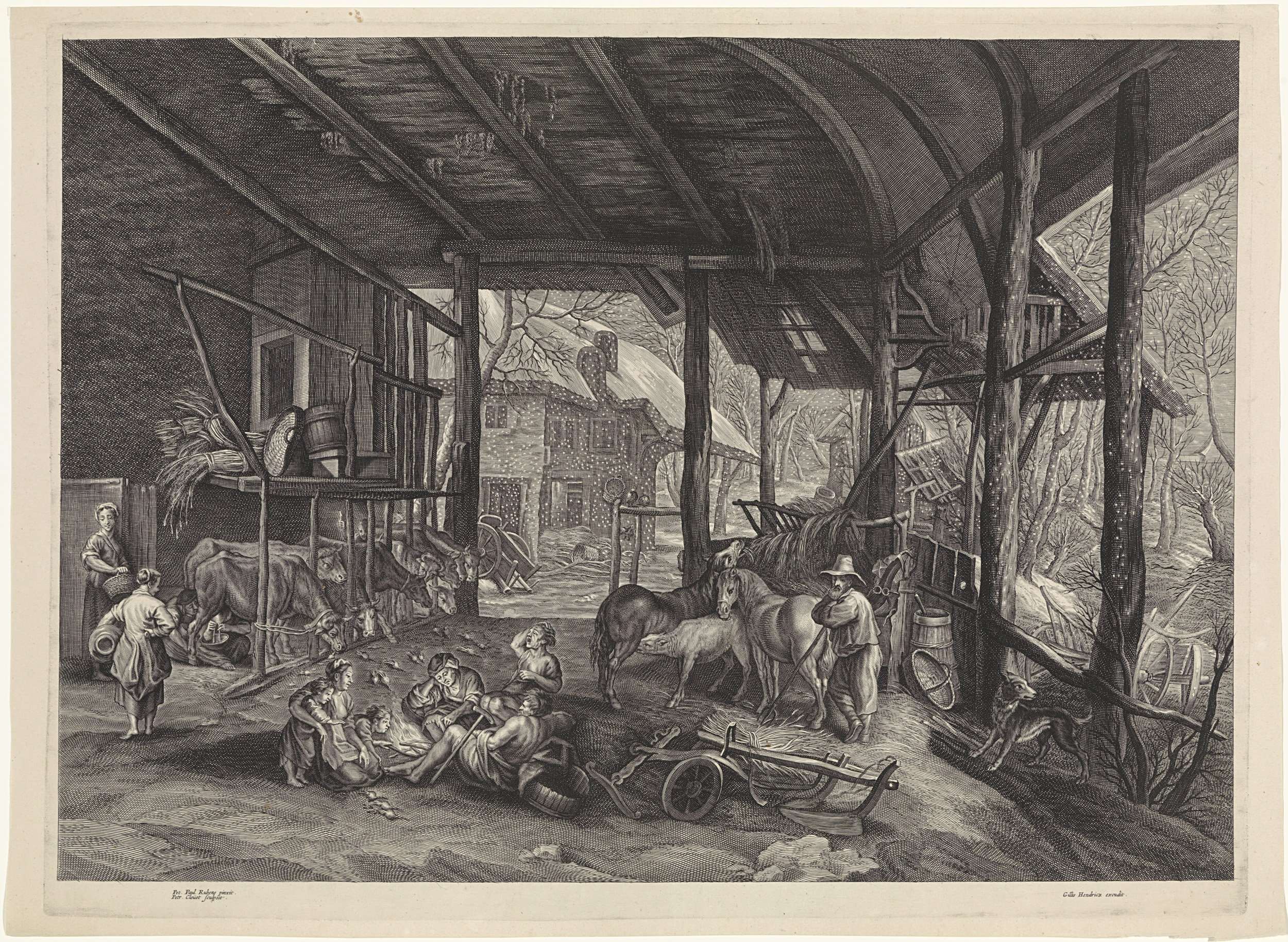 Een koeienstal in de winter. De koeien eten rapen en worden gemelkt. In het midden van de stal hebben zwervers een vuurtje gemaakt om zich te warmen. Buiten sneeuwt het.