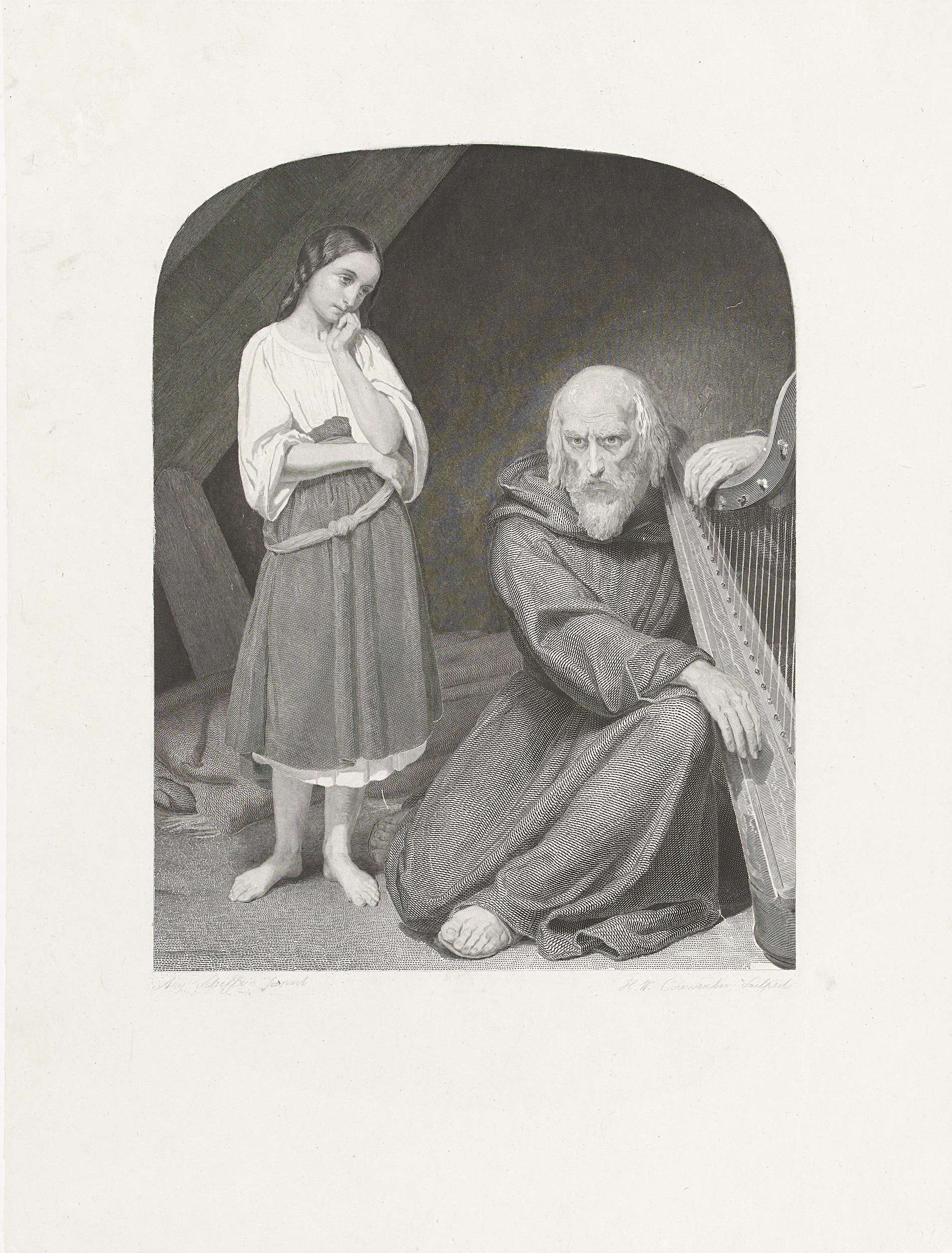 Meisje met oude monnik met harp