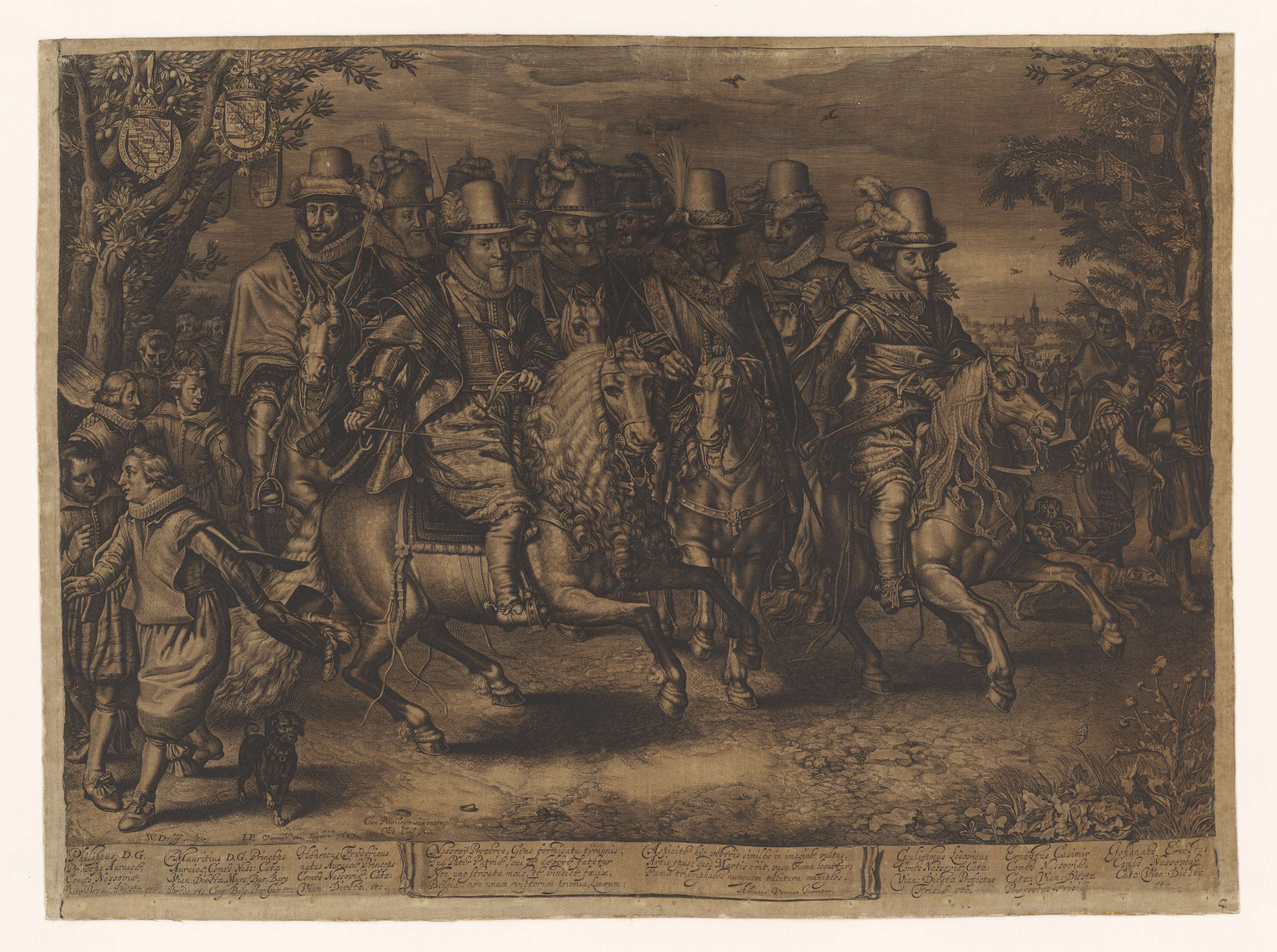 De zes prinsen van het huis Oranje-Nassau in optocht te paard met hun gevolg, van links naar rechts: Maurits, Filips Willem, Frederik Hendrik, Willem Lodewijk, Ernst Casimir en Jan Ernst I. In ondermarge Latijnse namen van de geportretteerden en cartouche met Latijns vers.