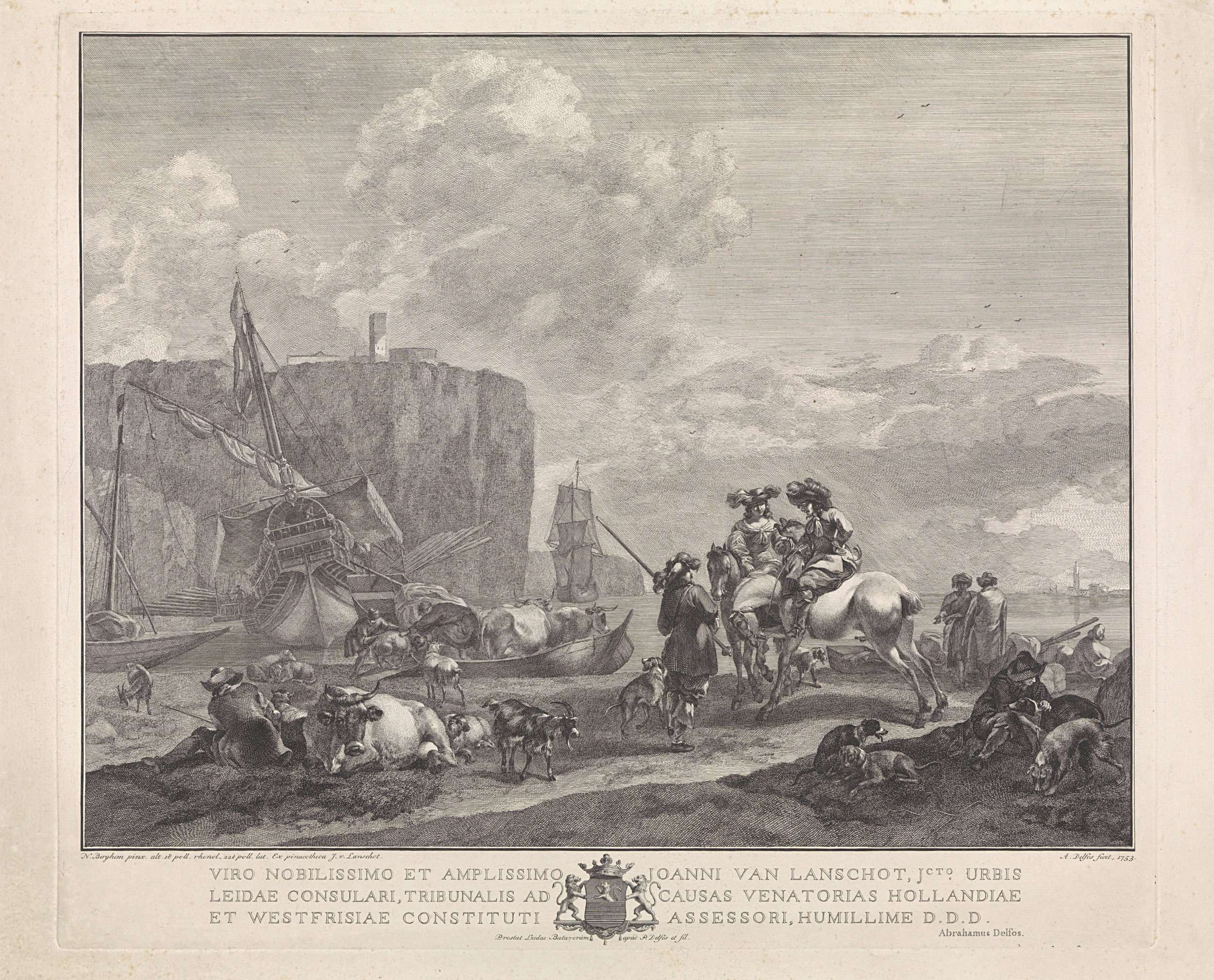 Een veerboot wordt geladen met vee bij zuidelijke kust. Schepen liggen voor anker en elegant paar te paard is in gesprek met man.